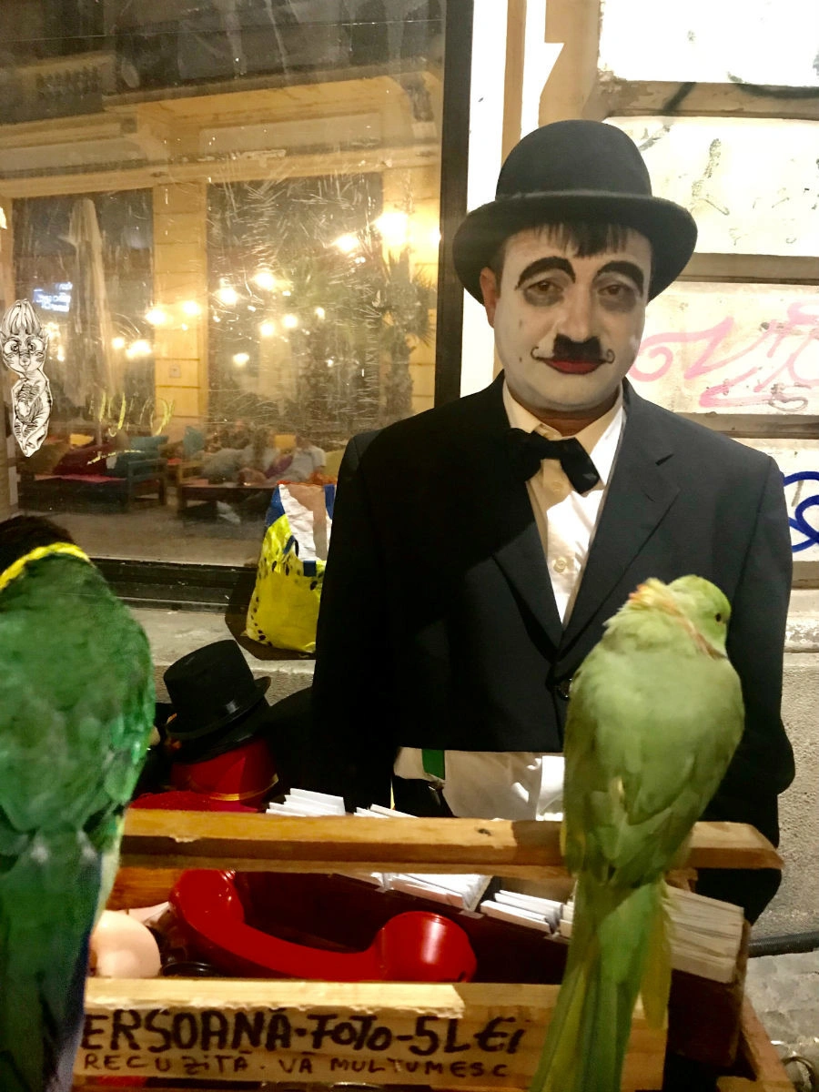 Ne învârtim încă o oră jumătate, timp în care simt că intru într-un fel de transă. Mă ia oboseala, mă dor picioarele și sunt copleșit de tot ce văd și aud. E aproape ora două când ne hotărâm să plecăm. Începe să bată vântul și cerul e negru, fără stele. La una dintre terasele de pe Smârdan apare iar bătrânul cu cărțile. Încerc să disting câteva titluri, dar nu văd decât un nume de autor: Camil Petrescu. La câțiva metri mai încolo e soția lui, lângă o plasmă pe care rulează știri. O imagine cu Firea și titlul: „Nu trebuie să alegeți între mine și Dragnea”. Sub lumina gălbuie a unui felinar, îl văd pe Enișor cu biletele lui de papagal. I se mai zice și Chaplin și e cunoscut ca fiind „ultimul flașnetar din București”. „Nu prea merge treaba.”, îmi zice Enișor. „Străinii ăștia… nu prea știu ei care-i treaba cu papagalii și cu biletele mele. Să știi că tot românii sunt mai dulci.”