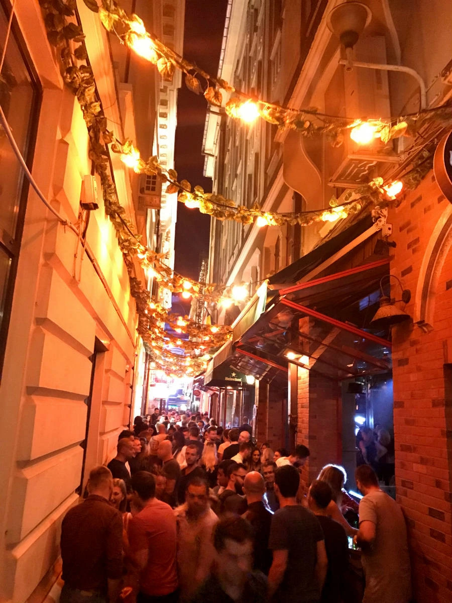 Mergem spre pasajul de lângă magazinul Bizon, un loc îngust în care se află mai multe baruri și unde duduie muzica. Un tip „deghizat” în Johnny Depp stă singur, rezemat de un perete, detașat de lumea care dansează în jurul lui. Intrăm în vorbă cu niște italieni, patru băieți din Salento, care sunt sunt super încântați de Centrul Vechi („extraordinar! e un loc viu, liber, fără restricții ! extraordinar!”). Unul dintre ei urmează să se însoare în octombrie, așa că prietenii l-au adus aici pentru petrecerea burlacilor. „Să veniți și voi în Salento!”, strigă ei după noi. „Jamaica Italiei, ganja, tot ce vrei!”