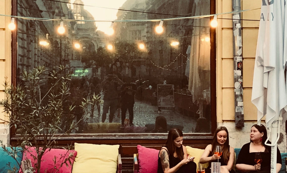 E deja întuneric când ne oprim pe Covaci, la Mahala. Nu găsim masă pe terasă, așa că stăm înăuntru, în dreptul unei carpete cu Răpirea din Serai. Ne luăm mici, bere fără alcool și suc. Eu nu mai beau de aproape o lună și Michele e „pe antibiotice”. Pe scurt, situația e cam așa: suntem doi abstinenți care dau ture prin Lipscani într-o seară de vineri și se uită la oameni cum se distrează. Ca să nu mai zic că pe Michele începe să-l doară măseaua. Ascultăm o romanță („când focul se aprinde în mine, numai puica îl poate stinge”) şi, cât mâncăm, Michele îmi povestește despre Trieste, oraşul lui natal. Îşi aduce aminte că, la scurt timp după ce s-a mutat în România, în anii ‘90, a fost la un concert Timpuri Noi, „chiar aici, în Lipscani”:„Eram în clasa a noua sau a zecea la Tonitza și venisem cu niște colegi. Ne-am îmbătat foarte tare și după aia ne-am dus în beciul ăsta unde era concertul. Și când au început să cânte Stere, a fost ceva incredibil. Înnebunisem cu toții!”