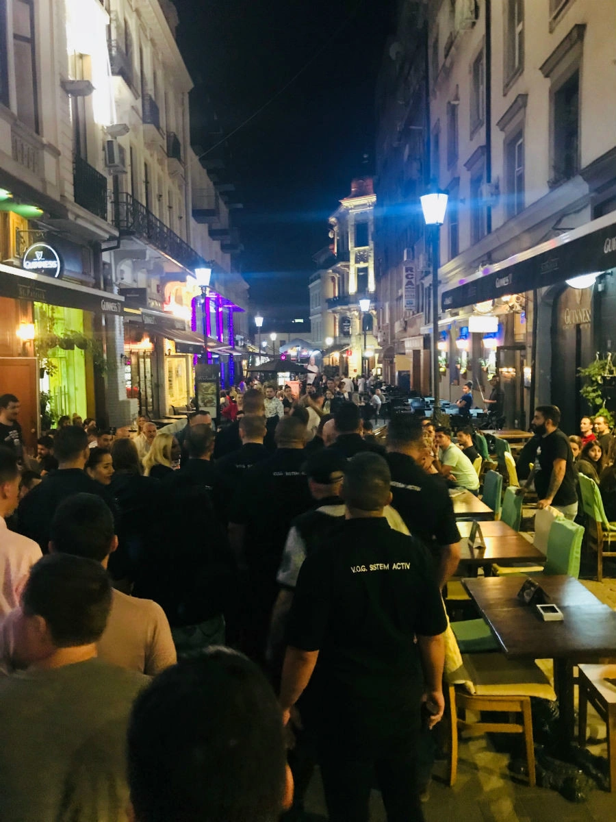 În față la BNR stăm de vorbă cu un polițist despre bătăile care au loc în zonă. „Mai ales pe Șelari și Smârdan, acolo se încing băieții.”, zice el. „O dau cu șprițul toată noaptea și după aia încep să se caftească. În general, se iau de la gagici. Străinii nu prea sunt cu violența, ăia vin să se îmbete - că asta le place -, dar nu ca să dea cu pumnul.” Omul se grăbește, așa că nu avem timp să povestim și despre cum îi bat polițiștii pe parcagii și pe jurnaliști.