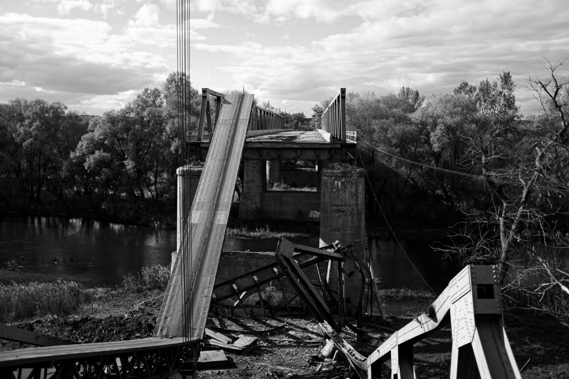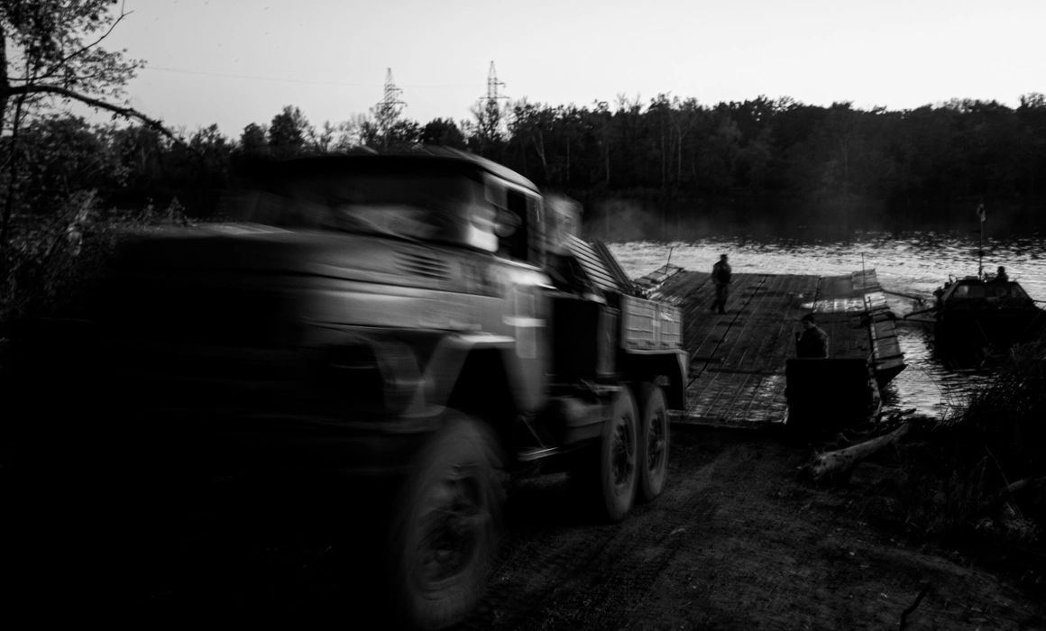 Pe drumul de la Kramatorsk la Liman am luat bacul peste râul Donețk de Nord. Râul a căpătat un rol important în bătăliile din regiune. Până atunci, nu mai văzusem niciodată atâtea poduri distruse - râul e acoperit de moloz și ruine. Unele poduri au fost distruse de armata ucraineană, ca să încetinească înaintarea armatei ruse, altele de armata rusă, ca să-și dea timp să fugă. Unde râul e mai îngust, armata ucraineană a reușit să construiască pasarele, dar unde e mai lat circulă un bac. E operat de două ambarcațiuni militare. Bacul transportă atât mașini, cât și echipament militar.