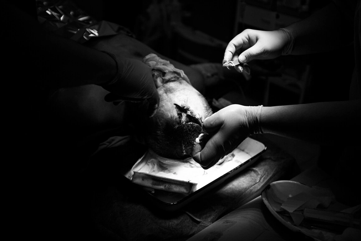 Din cauza penei de curent, la Slaviansk aveau adesea loc accidente - mașinile mergeau cu viteză mare pe întuneric. Ursu mi-a dat voie să fotografiez un bărbat rănit într-un astfel de accident. Îi coseau o rană la cap. M-am strecurat printre doctori cu aparatul și am simțit un miros amestecat de sânge și medicamente.