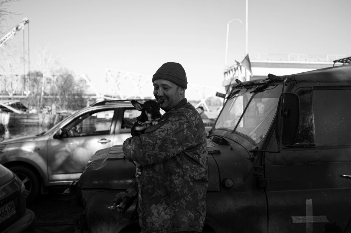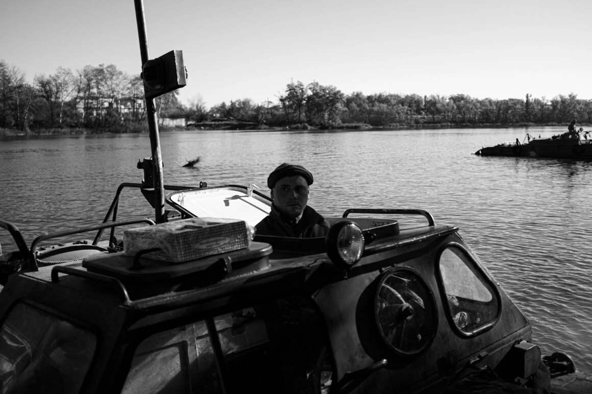 Militarul care conducea una dintre nave m-a lăsat să stau lângă el. M-am apropiat de el și am reușit să fotografiez totul în jur. Soarele strălucea puternic, militarul de pe bac mi-a făcut cu mâna, unul dintre ei avea un cățeluș cu el în mașină. Soldații ucraineni iau adesea animale cu ei - în satele distruse sunt multe animale abandonate, care au nevoie de îngrijire. Soldații le iau cu ei în tranșee și adăposturi, le hrănesc și le țin de cald. Vlad, cel care conducea ambarcațiunea, a zâmbit sincer când a văzut cățelul. Curând am ajuns pe malul celălalt și la despărțire am dat mâna cu Vlad, un soldat tânăr și frumos.