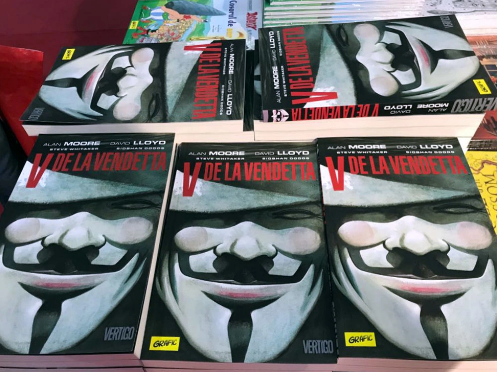 Când am fost la Comic-con anul trecut, m-a lovit până în plăsele dominația elementului de gaming, de la cosplay la spațiul expozițional oferit. Anul acesta, parcă pentru a se diferenția de concurență, Comic-con-ul a redevenit un pic mai mult despre comics și cultură. Nu-mi dau seama dacă a fost o decizie la nivel organizatoric sau pur și simplu o realocare a spațiului expozițional între jocuri, bandă desenată și merch, dar sentimentul general dat de hala de la Romexpo nu mai era de expoziție cu vânzare de jocuri pe calculator, ci de festival de cultură geek. Aleea artiștilor avea un spațiu mult mai mare repartizat și în centrul lui trona David Lloyd, artistul care a ilustrat celebrul roman grafic despre fascism și anarhie al lui Alan Moore, V for Vendetta. Știți voi, ăla cu masca de Anonymous, roman grafic lansat anul acesta și în limba română, la editura Paladin.