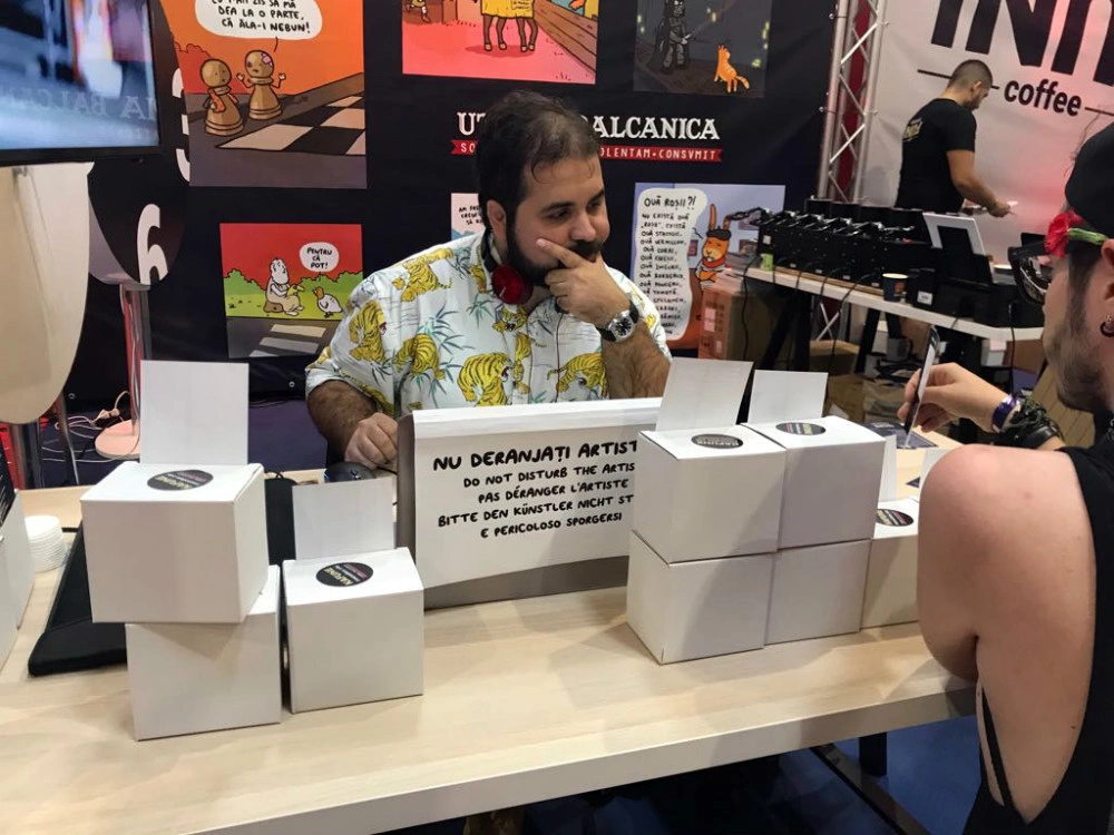 Anul acesta nu am fost singur la Comic-con, ci l-am cooptat ca insider pe Alin Răuțoiu. Alin este unul dintre cei mai buni critici de bandă desenată din România, precum și singurul individ amuzant din colectivul Dezarticulat. Rolul lui Alin în acest reportaj de la firul mochetei Romexpo este de animal spiritual, critic cultural, dar mai ales de paratrăsnet stângist. Alin cunoaște cam toți artiștii autohtoni de comics și, spre deosebire de majoritatea amatorilor de bandă desenată români (inclusiv subsemnatul), scoate banul ca să cumpere cam tot BD-ul românesc ce vede lumina zilei.