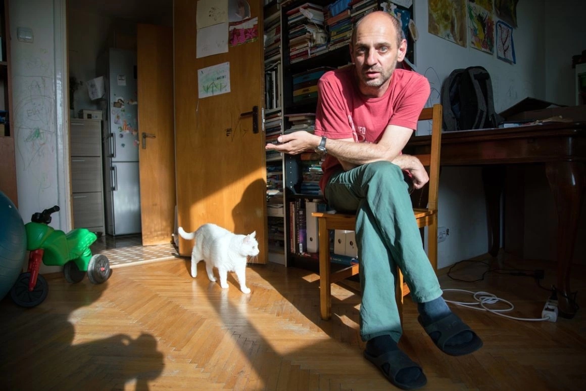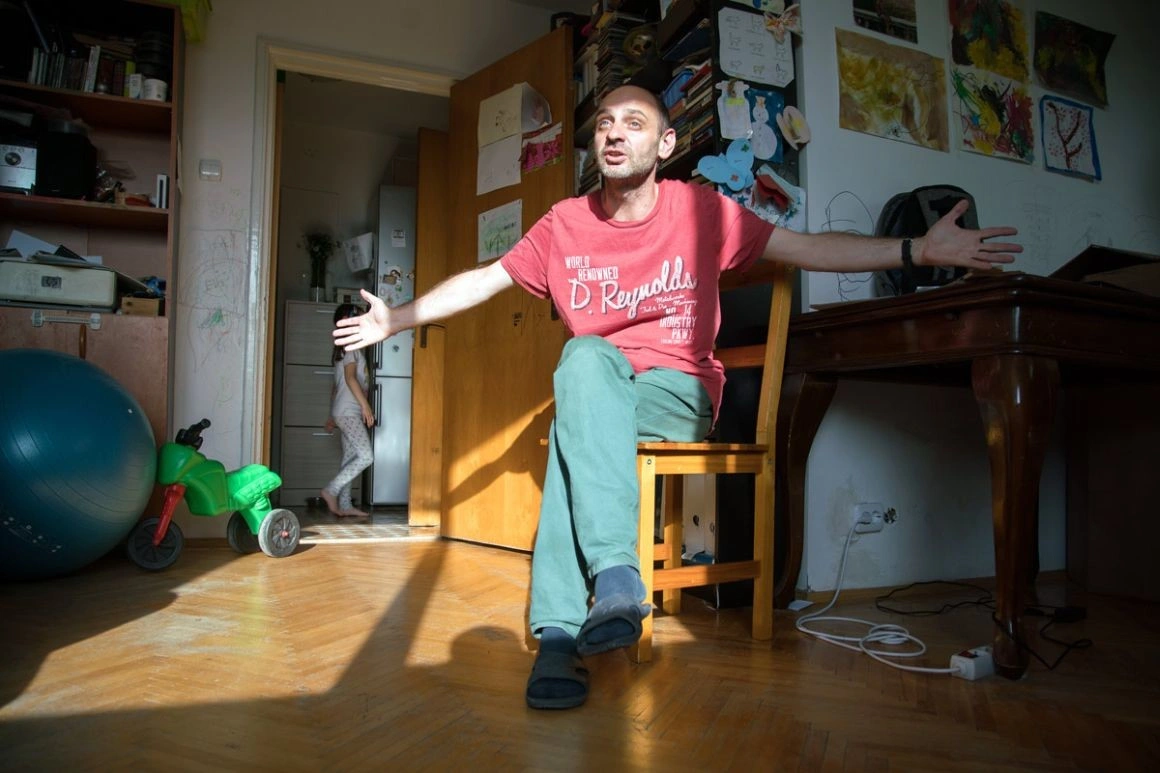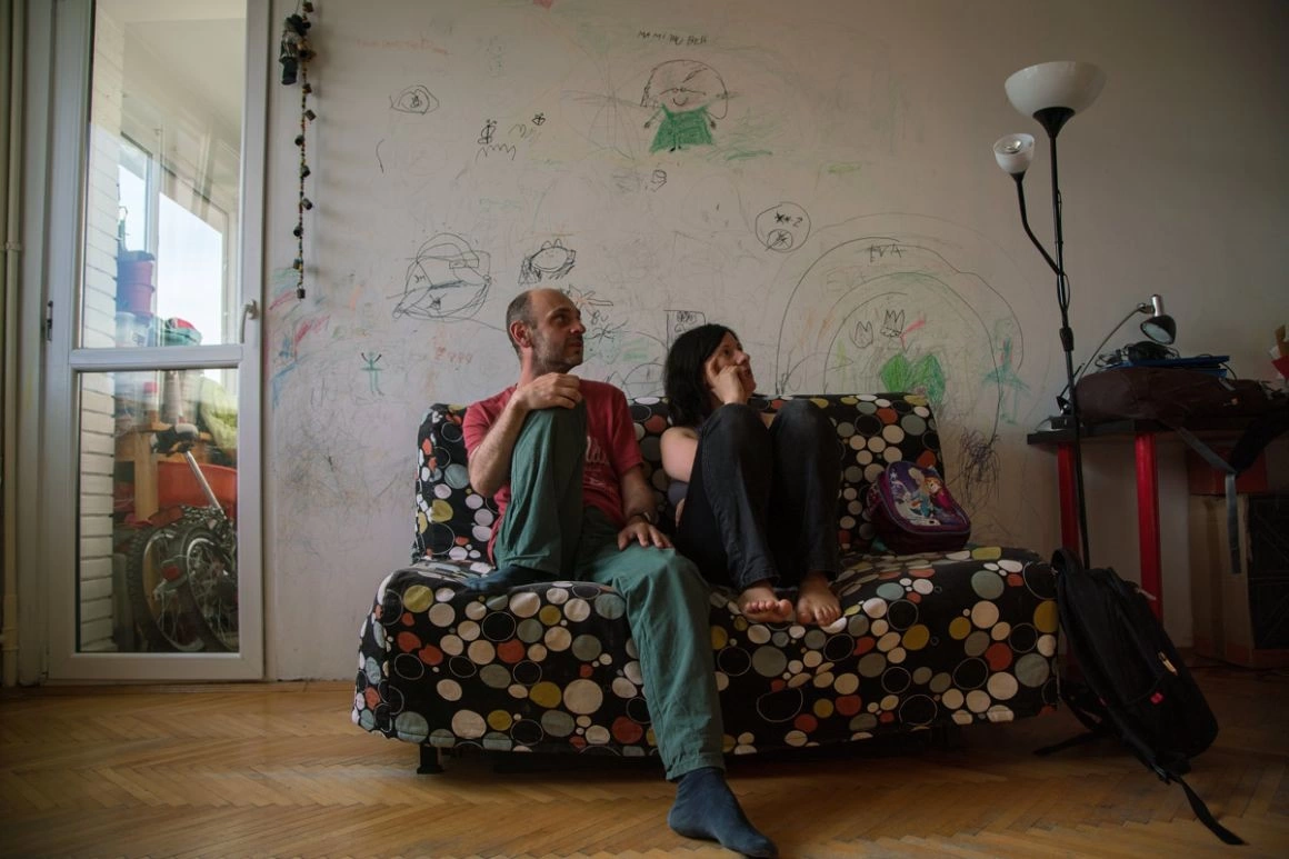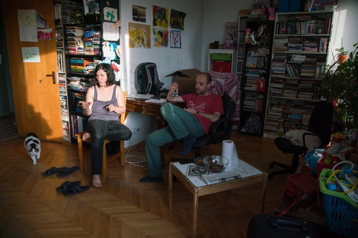 Elena, una dintre cele mai importante poete din România, îmi arată un birou încărcat - multe cabluri și două laptopuri - și spune că acolo ar trebui să lucreze ea. Scrie, însă, în bucătărie, unde se duce noaptea după ce adorm fetele. Din aceeași bucătărie vine acum un miros îmbietor de supă de găluște. Robert lucrează la cealaltă masă din living, dar zice că preferă să iasă în parc, unde gândeşte mai bine. Pentru show-urile lui, repetă în sufragerie. Fetele țipă și se ceartă constant cât stăm în vizită. „Uneori e aşa de dimineață până noaptea”, spune Elena. Familia lor e ca un perpetuum mobile - sunt mereu în mișcare, în căutare, nu au timp pentru concluzii. Așa sunt și spectacolele pe care le fac împreună de câțiva ani - pun întrebări, nu dau răspunsuri.