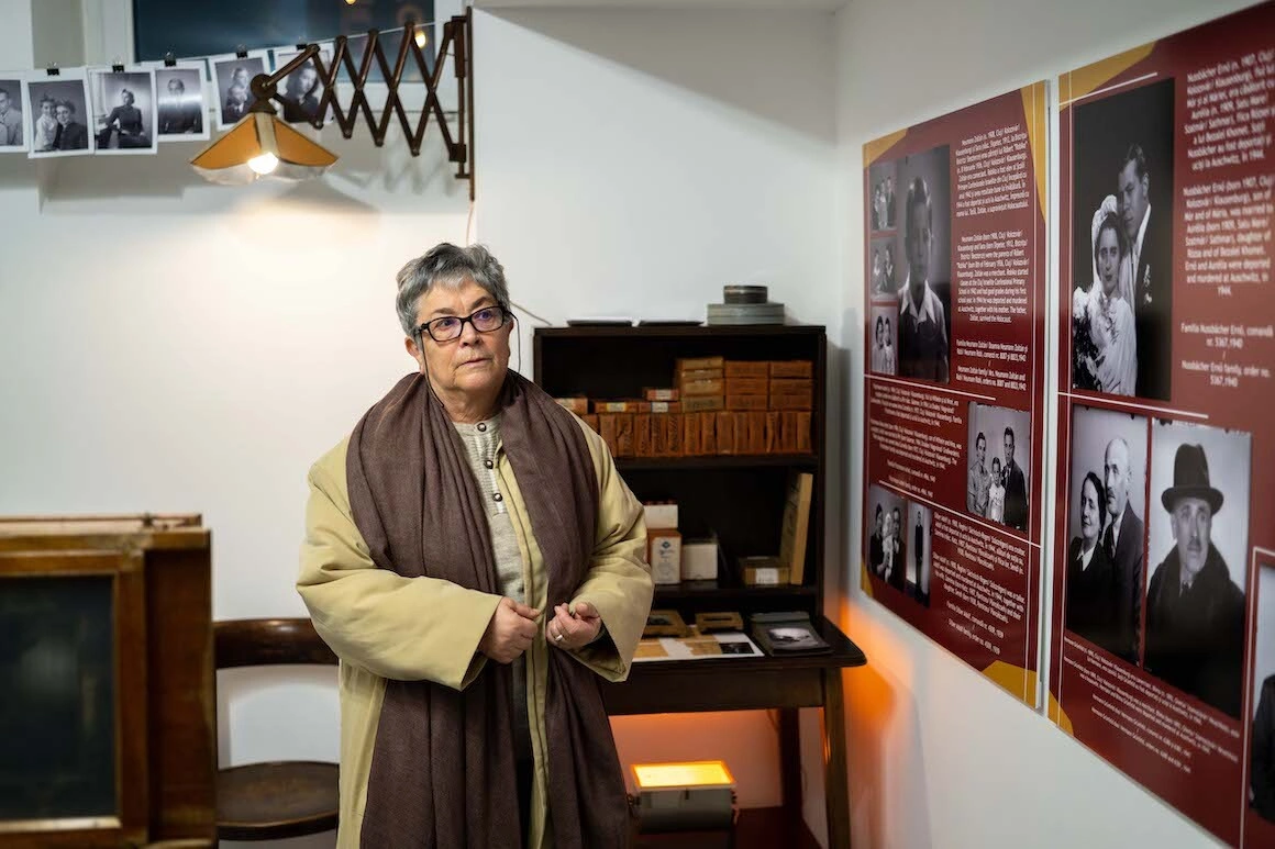 Simon Krisztina are 78 de ani și este printre primii care sosiți la vernisajul expoziției „Evreii lui Sárdi”. Vorbește cu organizatorii și privește cu mare atenție imaginile expuse.