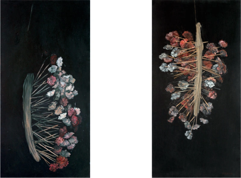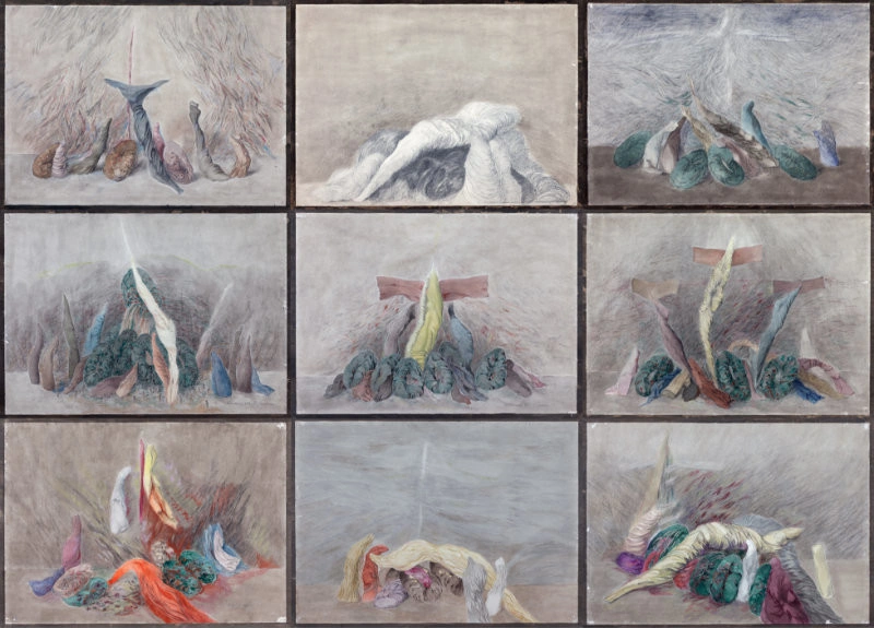 Pentru început, trebuie spus că formele textile în torsadă sau con sunt, de fapt, o legate de universul vizual al artistei, aceste forme fiind prezente în diverse ipostaze și în alte serii de picturi. De exemplu, în seria Lazăr în așteptare / 1992-1994, regăsim deja o mare parte din inventarul formal, cromatic și textural din Conviețuiri silențioase, după cum se vede mai jos.