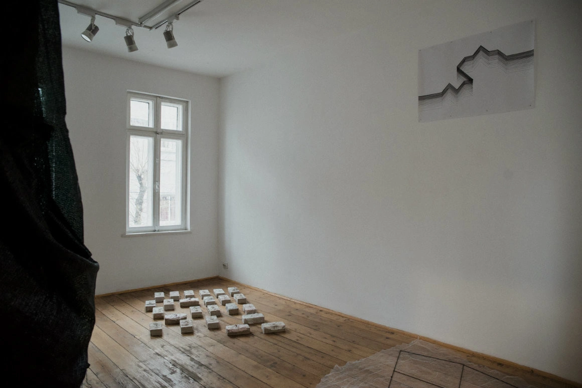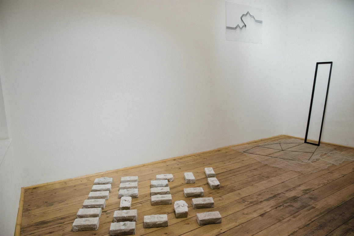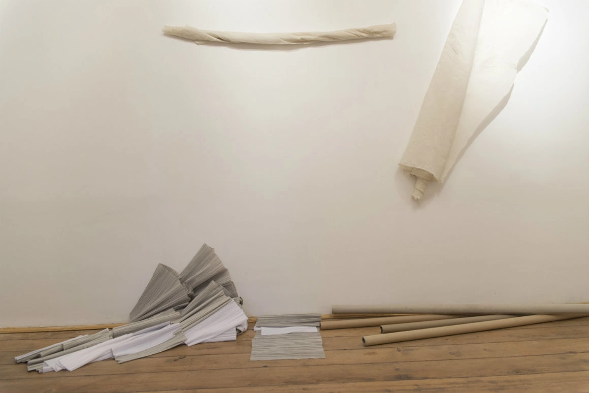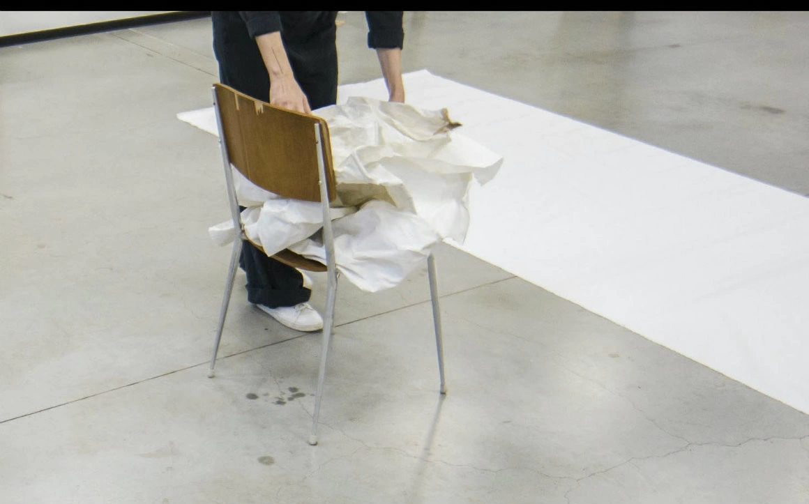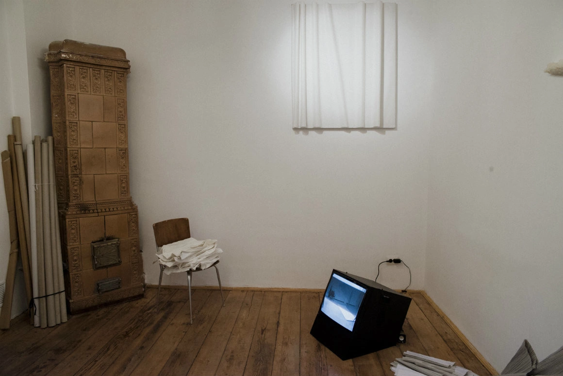 Lucrul ăsta e vizibil și într-un video dintr-una dintre sălile de expunere, în care vedem cum artista manevrează toate aceste lucruri, care în expoziție sunt niște urme. Și ele trec, pe rând, prin ipostazele de mai sus, fiind pe rând fundal, sculpturi, material folosit la performance sau obiect finit. Și la toate astea se adaugă și relația obiectelor și a procesului artistic cu spațiul care le găzduiește.