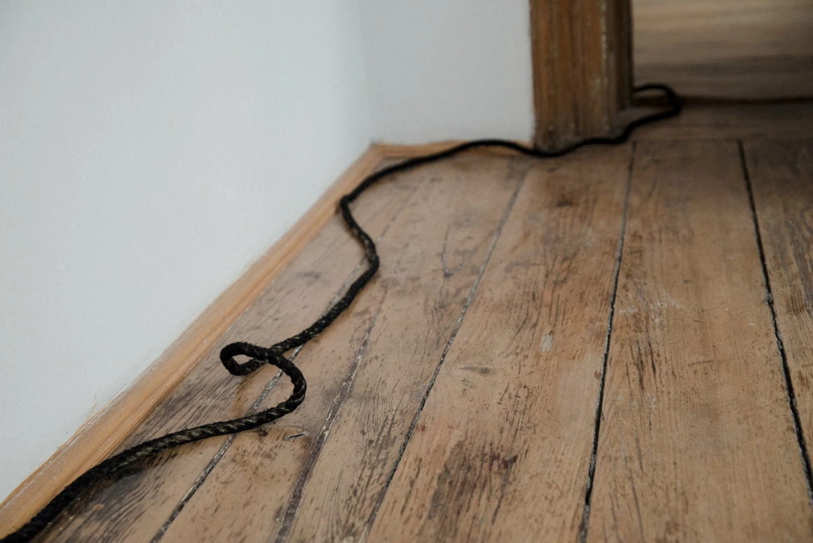 Adelina Ivan a ales și ea să adauge un element uncanny, adică neliniștitor, sub forma unei funii negre care coboară din cuva de metal, ajunge pe podea și apoi iese din cameră, ca să se piardă undeva sub faldurile unei lucrări din camera vecină.