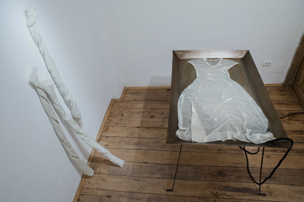 Exagerez un pic interpretarea, pentru a sublinia totuși o înțelegere destul de plauzibilă, care se naște din obiect. O rochie albă impecabilă, transparentă, poate o rochie de mireasă, prin care poți vedea corpul tânăr și seducător, dar mort, plutind sub apă, înecat. Care e legat, la propriu, de ceea ce apare de la prima vedere ca o machetă redusă la scară a unei fațade urbane de oriunde din București, care mai are puțin și se dărâmă peste trecători. O ruină.