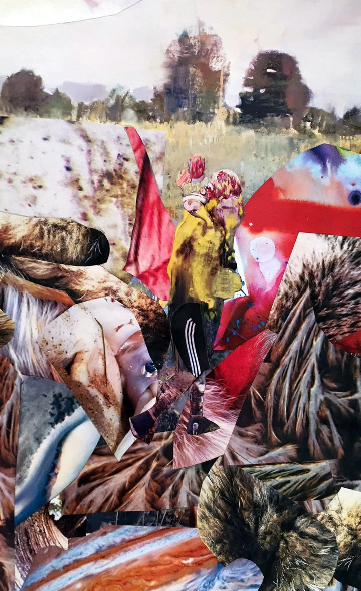 Dacă ar fi să ne luăm după felul în care sunt aranjate lucrările în expoziție, lucrarea centrală este Degenerate Art - un portret deconstruit al lui Van Gogh, în dreptul căruia este instalată singura banchetă din galerie. În jurul ei sunt trei autoportrete și două colaje - o ocazie bună să trag cu ochiul la felul în care își construiește Ghenie lucările de mare întindere. Recent, artistul a început să folosească colaje pentru a-și dezvolta structura picturilor. E un demers interesant să observi cum elemente din colaje sunt traduse în culoare pe pânză, în timp ce alte detalii sunt înlocuite complet. De exemplu, ochiul stâng al lui Van Gogh era cu totul altfel în colaj decât ochiul negru de pește-cyborg care a ajuns în pictura finală.