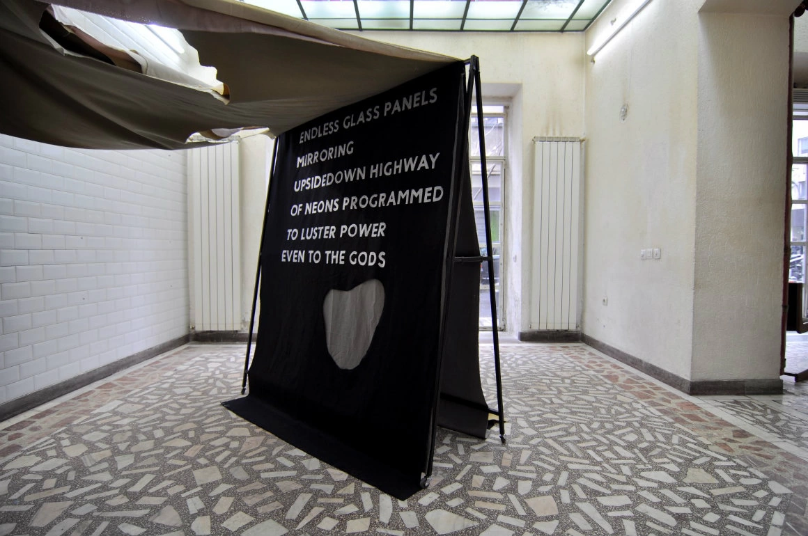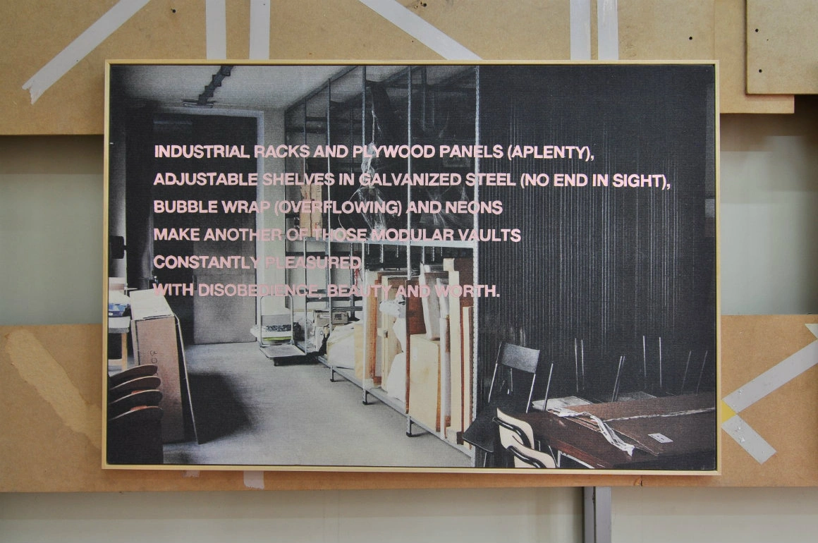 Dragoș s-a fâstâcit un pic, dar a venit cu un răspuns care mi s-a părut interesant. A zis că da, e artă critică, dar nu într-un mod evident. Pentru că, spre deosebire de alți artiști locali, nefiind activist, el și, prin extensie, grupul Apparatus 22, nu pot vorbi de pe o poziție angajată. Actul critic e pentru el ceva care vorbește de pe poziția lui socială, dinspre interesele lui personale, cu mijloacele care îi sunt caracteristice lui. Răspunsul ăsta m-a mulțumit doar pe jumătate, pentru ca îmi era greu să văd care e mai precis zona în care acționează această critică și care sunt metodele ei. Totuși, pe măsură ce Dragoș îmi prezenta expoziția, mi-am dat seama că pânzele astea cu scris erau mai puțin interesante ca imagini și mult mai interesante ca text. Consideram că e oarecum o eroare să le compui atât de bine, ca un montaj de design perfect în Photoshop sau în Illustrator, pentru că textul cu imagine devine doar imagine, iar receptarea textului se face doar la nivel grafic, nu semantic.