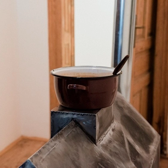 Din start, e nevoie de o completare chiar la acest nivel de conținut, pentru că expoziția nu vorbește doar despre moarte. Miezul universului simbolic pe care ni-l propune expoziția lui Belu-Simion Făinaru, sculptor israelian de origine română, este imaginea casei. Care e prezentă la etajul întâi, transformată într-o sobă de tablă. În sobă se pun pastile de rumeguș și înăuntru arde un foc. Acest foc face trimitere și la arderea de tot, traducerea mot-a-mot a cuvântului Holocaust.