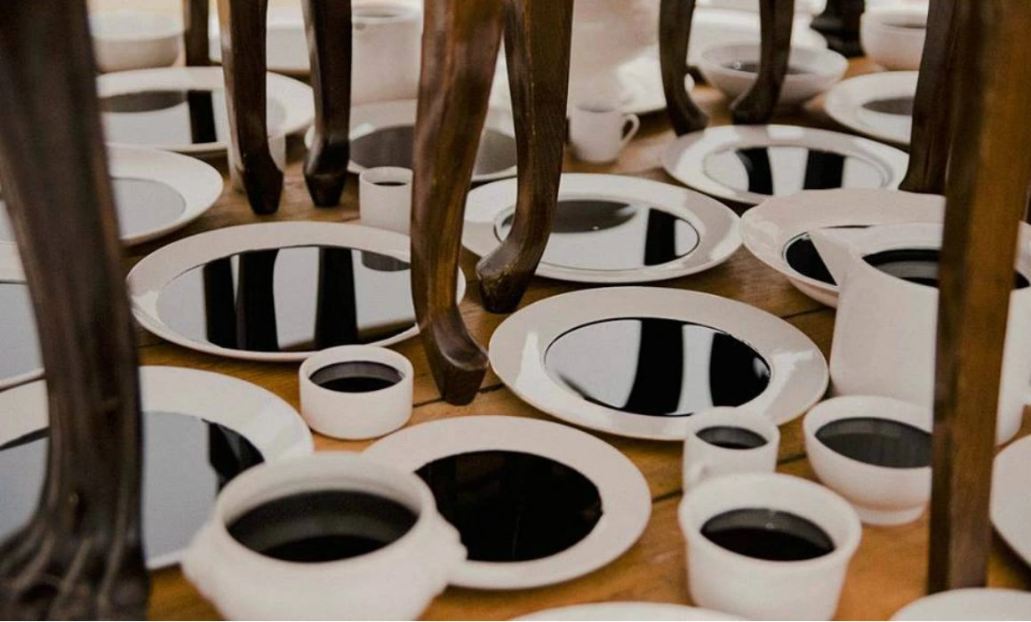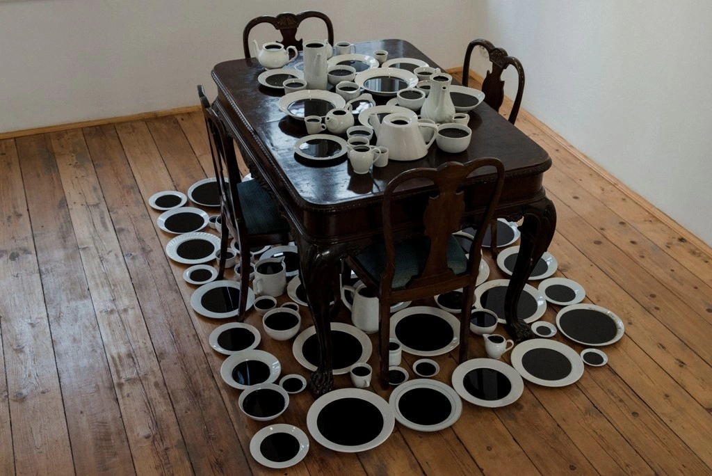 Desigur că un asemenea limbaj e incomod, pretențios și poate părea chiar o prostie, spus așa, direct și naiv. Intenția mea e, totuși, de a brusca un pic limbajul și chiar și cititorul, pentru a-l apropia, poate ușor forțat, de congruența simbolică dintre corpul uman, casă și lumea în care trăiește. Această operație merge în spiritul lucrărilor din expoziție, unde, de exemplu, o pălărie de fetru întoarsă cu gura în sus trimite la vidul ontologic. Iar niște farfurii, niște ceainice și niște căni pline cu ulei de motor ars trimit la pierderea tragică a vieții. Un panou luminos circular e folosit ca fundal pentru o fotografie transparentă cu un cer albastru de vară, imagine care trimite în mod direct și la accepțiunea lui simbolică, de rai.