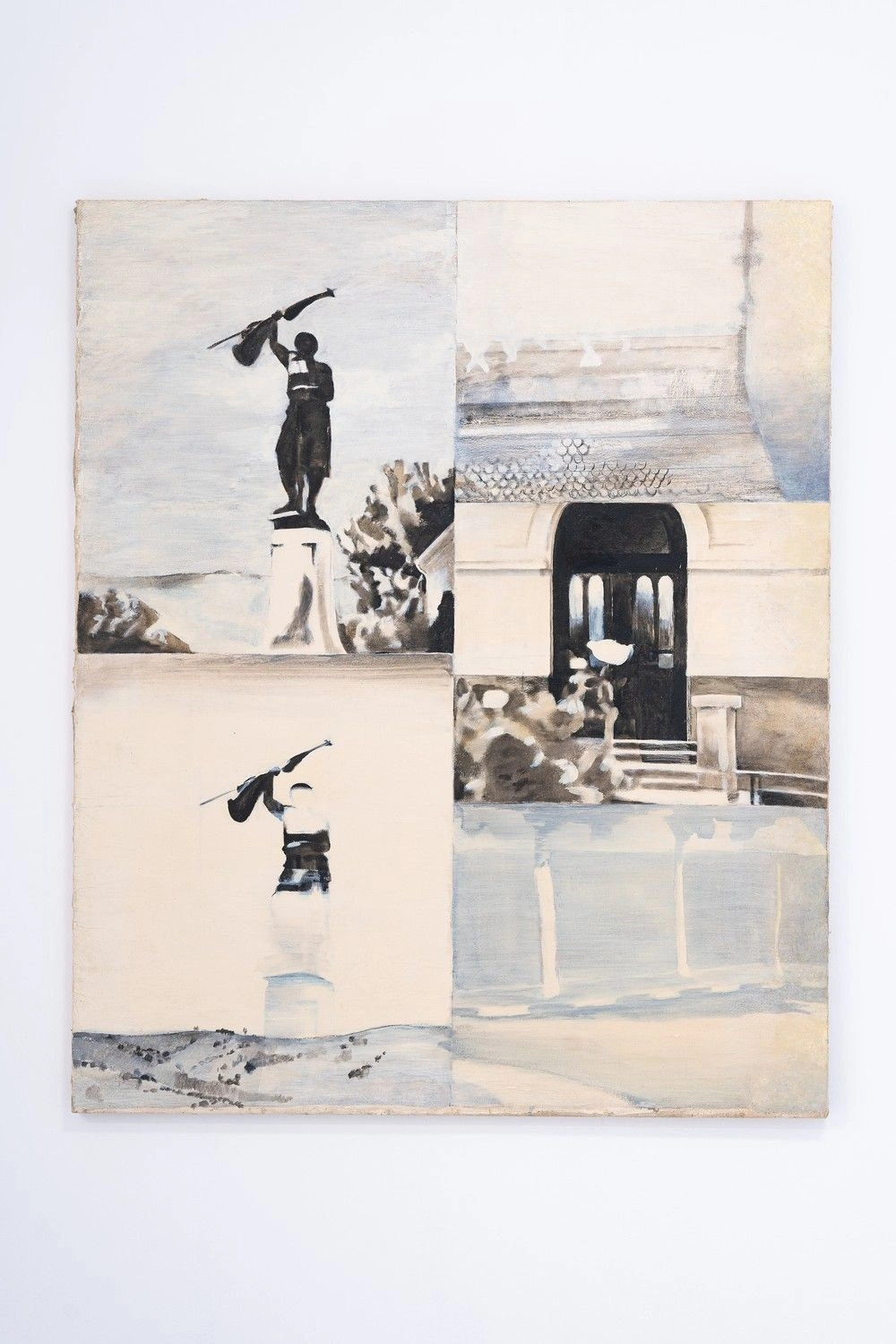 La Florina Lăzărescu, imaginea e de altă factură. Monumentul unui soldat din Primul Război Mondial devine suport pentru o speculație poetică pe tema memoriei. Nu e neapărat vorba de Primul Război sau de eroism. E vorba de asocierea liberă a unor repere vizuale puternice, probabil cu o rezonanță intimă importantă pentru artistă, o serie de fotografii care devin filmul incomplet al unei reverii. Panoul din dreapta jos e doar o margine de drum, sub niște copaci printre care se vede orizontul câmpiei. Iar cel din dreapta sus e acoperișul unei instituții de stat, judecând după elementele elaborate de arhitectură care compun respectivul fragment.