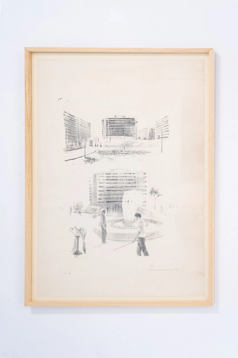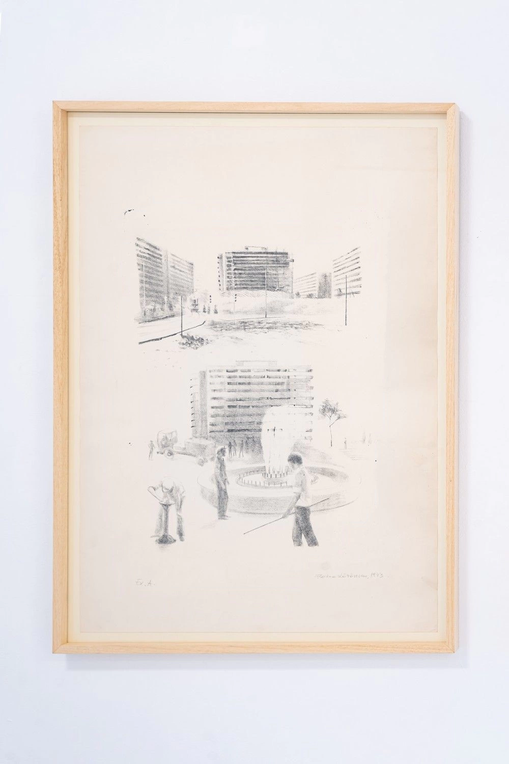 Grăitoare în acest sens este litografia denumită „Fântâni”. Ea este, de fapt, un colaj fotografic cu mai multe elemente urbane din București. În partea de jos e fântâna din mijlocul Parcului Tineretului, de lângă pod, mergând dinspre Liceul Șincai către Sala Polivalentă. În spatele fântânii, un bloc de la Bucur Obor, din planul secund al intersecției, privind către Colentina, aproape de zona străzii Ziduri Moși. Iar în panoul de deasupra, același bloc de la Obor, de data asta în amplasamentul său urban real, de dinaintea construirii magazinului Bucur Obor, care urma să se ridice în partea dreaptă a imaginii.