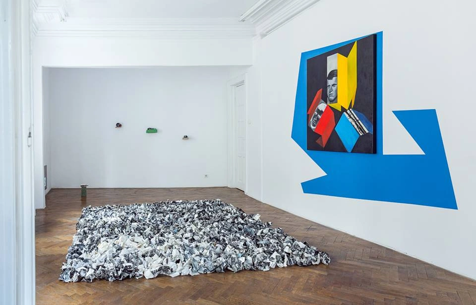 Expoziția e pentru două tipuri de public. Unii vor vedea doar jocul cu formele geometrice, raporturile de culoare și compoziția spațiului și a lucrărilor. Și materialitatea diverselor exponate, care merg de la coperți cartonate de cărți din care au fost smulse paginile, până la picturi monocrome pe pânză, peste care artistul a proiectat, ironic, fotografii alb-negru, transformându-le în foto-picturi. Dar și desene, colaje, obiecte și instalații. Un covor de pagini smulse și mototolite aranjate într-un pătrat pe podea. O pictură (pop?) montată într-o formă geometrică ce amintește de constructivismul rus, dar și de întreaga serie de foto-picturi ale lui John Baldessari – cele cu forme colorate suprapuse peste fotografii.