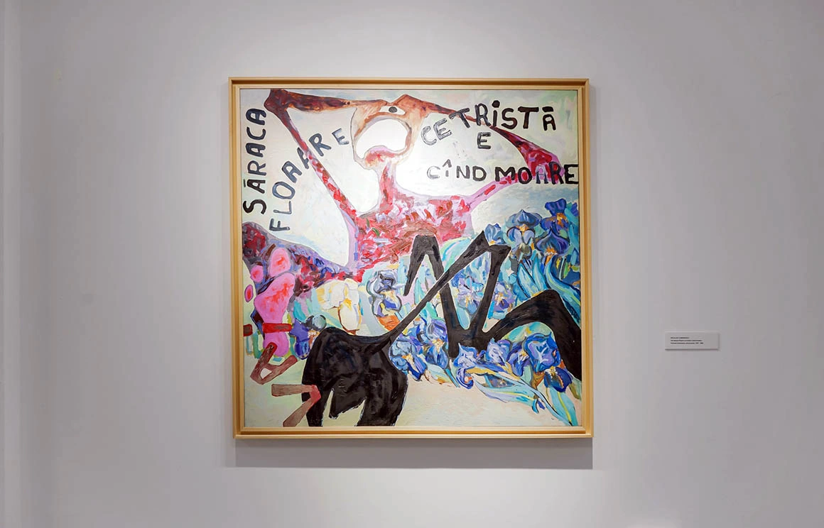 Ciclul viață-moarte nu putea să nu fie o temă centrală a unei expoziții care are în prim plan toxicitatea, generoaroare de întrebări-cheie: cât din această toxicitate este toxicitate în sine și cât este dorința umană a extirpării oricăror obiecte, plante sau ființe pe care nu le înțelegem? E ademenitor să gândești asta într-un mod aproape science-fiction à la Orson Scott Card din Jocul lui Ender, unde o întreagă specie conștientă e distrusă de umanitate, parțial din frică, parțial pentru că poate s-o facă. Poemul-tablou Vai săraca floare ce tristă e când moare, de Nicolae Comănescu vine ca o reprezentare directă a acestei idei. Întâmplător, acest poem-tablou amuzant, ironic, hilar până aproape de grotesc, a fost preferatul meu și, împreună cu (In)plant, camera cu oglindă spartă și iederă agățătoare (o instalație de Natalia Silaghi), în care se împletesc grozav ideile de viață și distrugere, mi-au oferit mediul perfect de analiză și înțelegere a expoziției. Instalația (In)plant a Nataliei Silaghi e interesantă și pentru alegerea iederei, nu doar a oglinzii sparte: iedera are atât proprietăți toxice (fructul e otrăvitor), dar și benefice (frunzele sunt tămăduitoare). Instalația îmbină coruperea și vindecarea, forțându-le să conviețuiască și poate, într-un fel, asta ne duce cu gândul și la viciu, o parte plăcere, o are autodistrugere. Poemul tablou al lui Nicolae Comănescu mi s-a părut interesant și pentru că reprezintă un umor aparent primar: pictează Țipătul lui Munch în stil propriu, redând ironic titlul picturii pe imagine. Dacă la origine Țipătul lui Munch simbolizează anxietatea condiției umane, Nicolae Comănescu îl reinventează într-unul al anxietății vegetale, de unde te poți gândi imediat la intervenția umană asupra lumii plantelor, mai ales datorită imaginii ambigue: ar putea fi un om sau o floare cu caracteristici umane.
