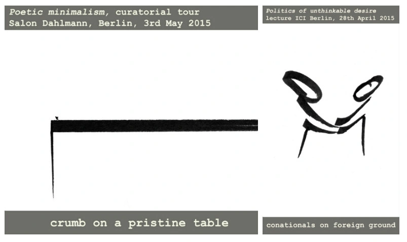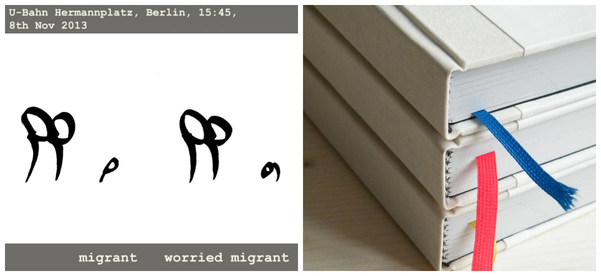La carte am ajuns acum. E mai mult un sumar tragicomic a ce am strâns de-a lungul anilor ca observații. Dar cum am pornit? Când m-am mutat în Berlin, datorită șocului cultural, am început să iau notițe despre oameni, lucruri pe care le observam pe stradă. Mi se păreau interesante. Nu știam încă cum să le transpun artistic. Făcusem înainte pictură figurativă la Cluj, bazată pe documentare fotografică, pe schițe. Pentru a capta niște elemente care dispar într-o secundă, unele de psihologie și nu doar de cum arată ceva, a trebuit să-mi găsesc un desen foarte simplu, cu care să schițez rapid ce văd. Astea s-au transformat în așa-zisele notițe vizuale. Am o arhivă vizuală. Totul se transformă apoi într-o instalație. De exemplu, aici am fost la o expoziție, pe o masă impecabilă de sticlă era o firimitură de pâine. Aici sunt unii care se uită așa de atent la o lucrare că se uită chiar și în spatele ei, dacă e pusă pe perete. Aici sunt două persoane la ICI Berlin care și-au dat seama că sunt co-naționali. Nu se cunoșteau, dar sunt așa, foarte topiți.
