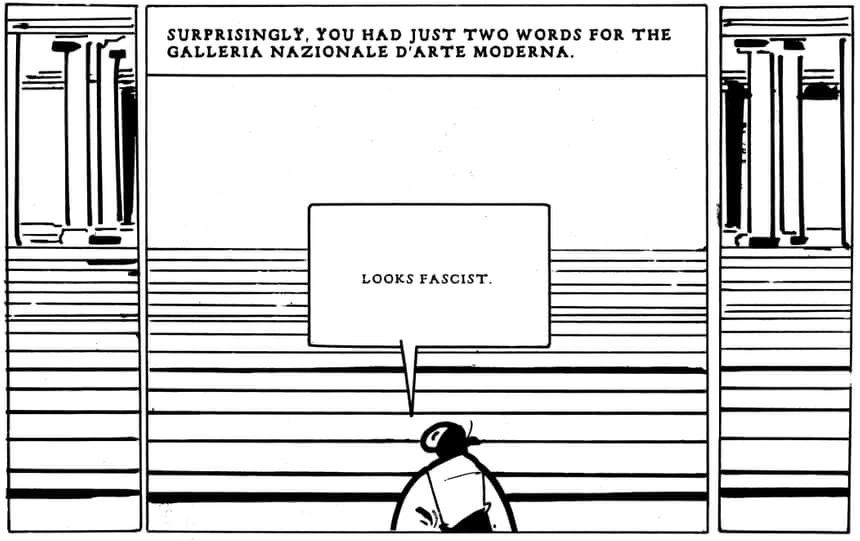 Așa e, în doi pași e totul mai interesant. În ultimul timp tot mai multe dintre poveștile mele apar în publicații. Cea mai recentă a fost în The Guardian. Aici, aceasta este o fanzină scoasă pentru Berliner Week 2018. Și aici tema era project space. O poveste comică, o fantezie pornind de la spațiul nostru The Fact Finder. Reușind să găsesc fonduri, mi-am imaginat un traseu comic și improbabil. Mă interesează așa de mult domeniul romanului grafic: este excelent pentru povestire, pentru comunicare. În aprilie, vom avea o expoziție pe această tenă, a romanului grafic. Vom avea mulți artiști din Italia, America, Germania. Noi avem specificul ăsta, că ne place să lucrăm cu arhive, cu note și cu observații. Să clădim un material în timp. Vom expune nu numai produsele finite, pagini printate sau cărți ci tot ce înseamnă making of, adică notițe, scenarii, desene de cercetare, desene care nu au fost publicate.