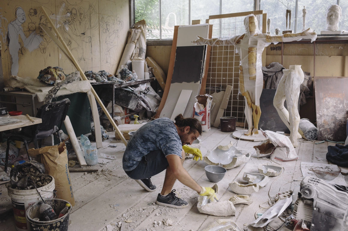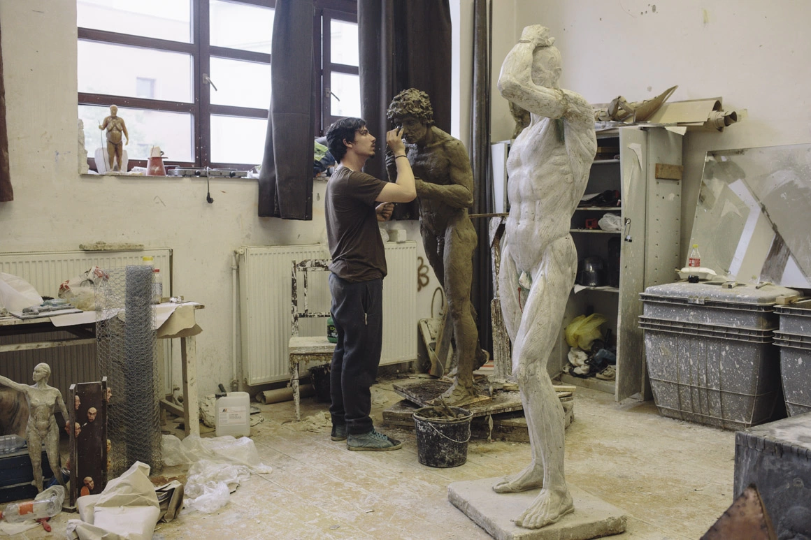 Am ajuns la Facultatea de Sculptură din București când studenții din ultimul an își pregăteau lucrările cu care să încheie cei trei ani de școală. Într-un atelier ca un templu boem al dezordinii, cineva turna în rășină albăstrie un braț îndoit, iar în altul, un tip concentrat modela în lut orbita unui bărbat din familia nudurilor clasice. În sala de lângă, ca într-un vis, dădeai peste mai multe variante ale aceluiași bărbat de lut, un pic adus de spate, cu burta rotundă. Afară, la umbra copacilor, un băiat lipea în flama aparatului de sudură maxilarul unui urangutan din fier beton. Alături, un coleg se chinuia să desprindă din coaja de ghips mulajul unei primate miniaturale. Pe fundal se-auzea țăcănitul zarurilor la o partidă de table. Peste tot, prin curte, zăceau împrăștiate forme abstracte de piatră, portrete abandonate peste care se ridica iarba, o jumătate de centaur, un spate de femeie cu tot cu fese, sprijinit lângă o lopată, resturi de materiale și tot felul de idei modelate.