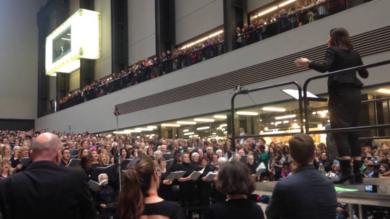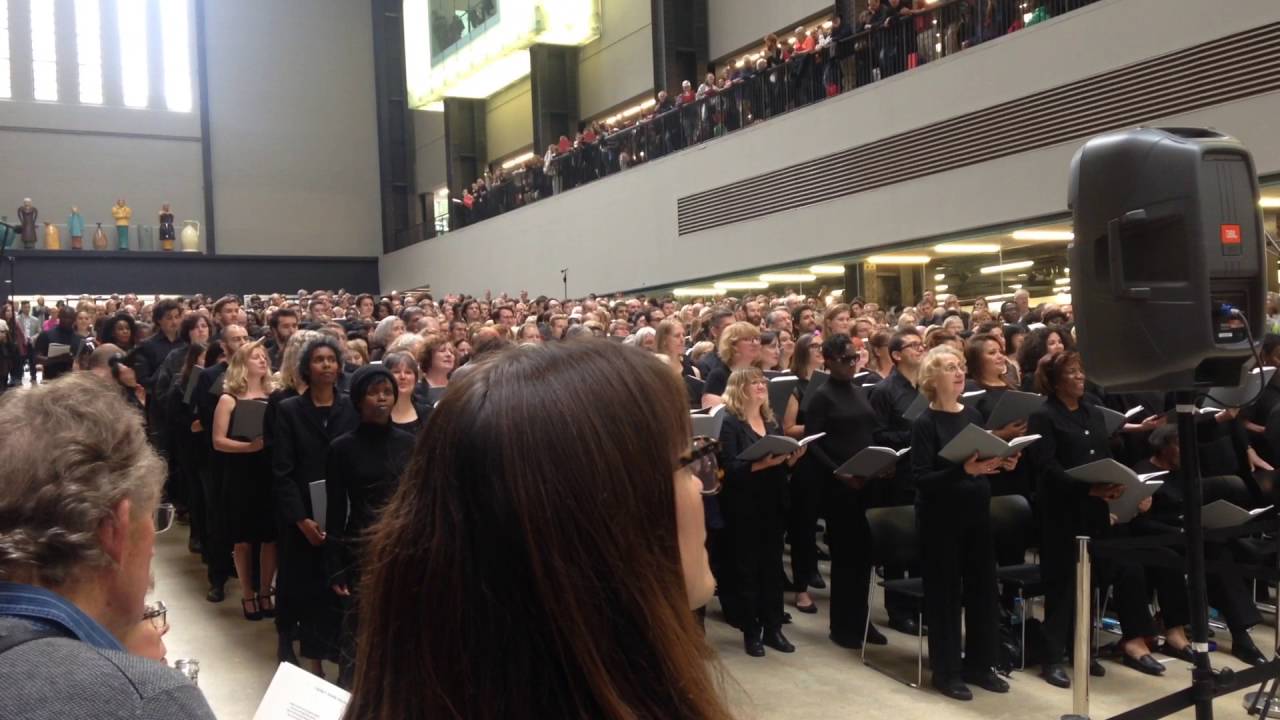Vizitatorilor noului Tate Modern li s-a pregătit, printre sute de lucrări care mapează arta modernă prin toate mediile posibile, o lucrare monumentală pe care o fac posibilă 500 de voci. Lucrarea The Bridge, compusă special de britanicul Peter Liversidge pentru Turbine Hall, constă într-o serie de piese muzicale care traduc istoria fostului soațiu industrial convertit la artă. Interpretarea ei de către 500 de cântăreți din 24 de coruri de amatori din Londra a fost highlight-ul inaugurării, miza fiind să dea spațiului viață prin voce: „Cel mai important lucru a fost impresia unei comunități foarte mari laolaltă, care să cânte ca și când ar fi unul, un singur gând, o singură idee”, explică Liversidge.