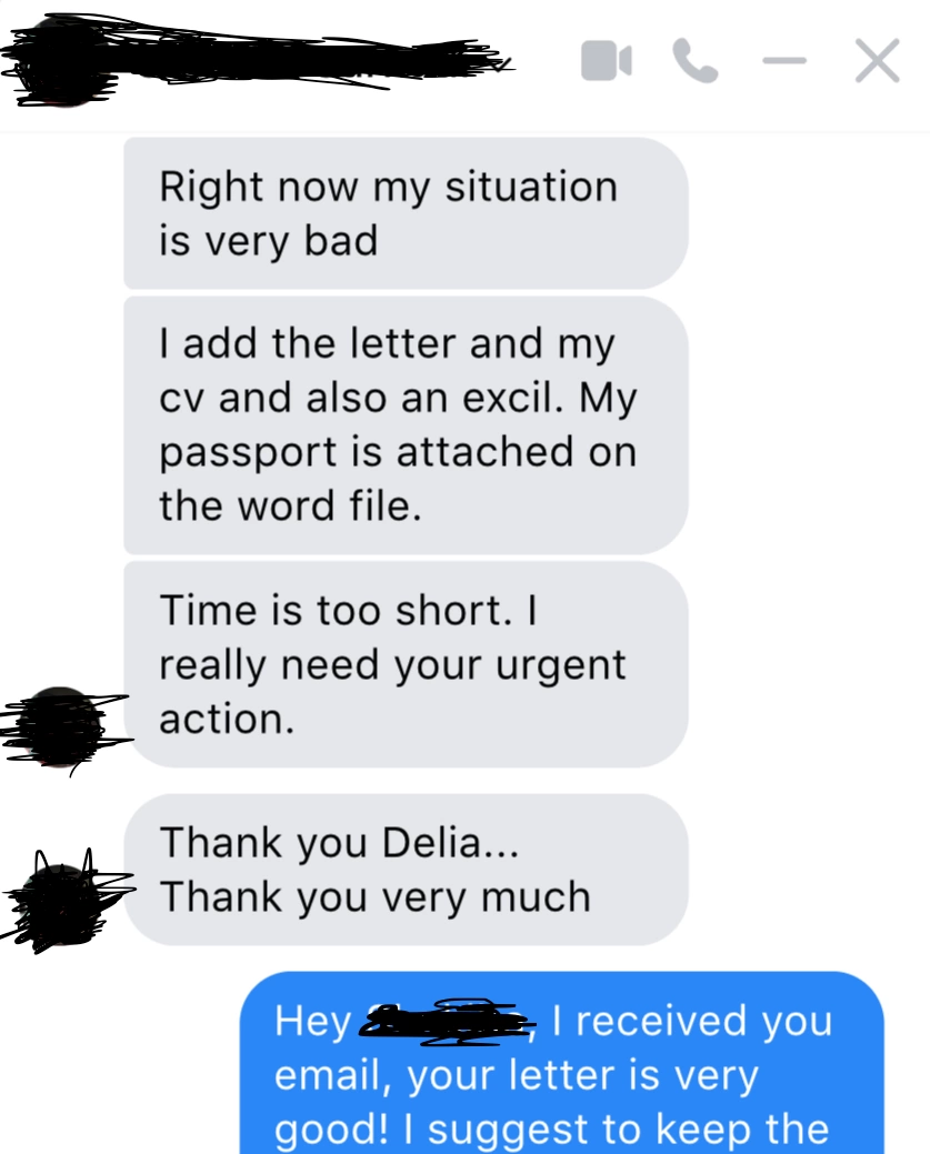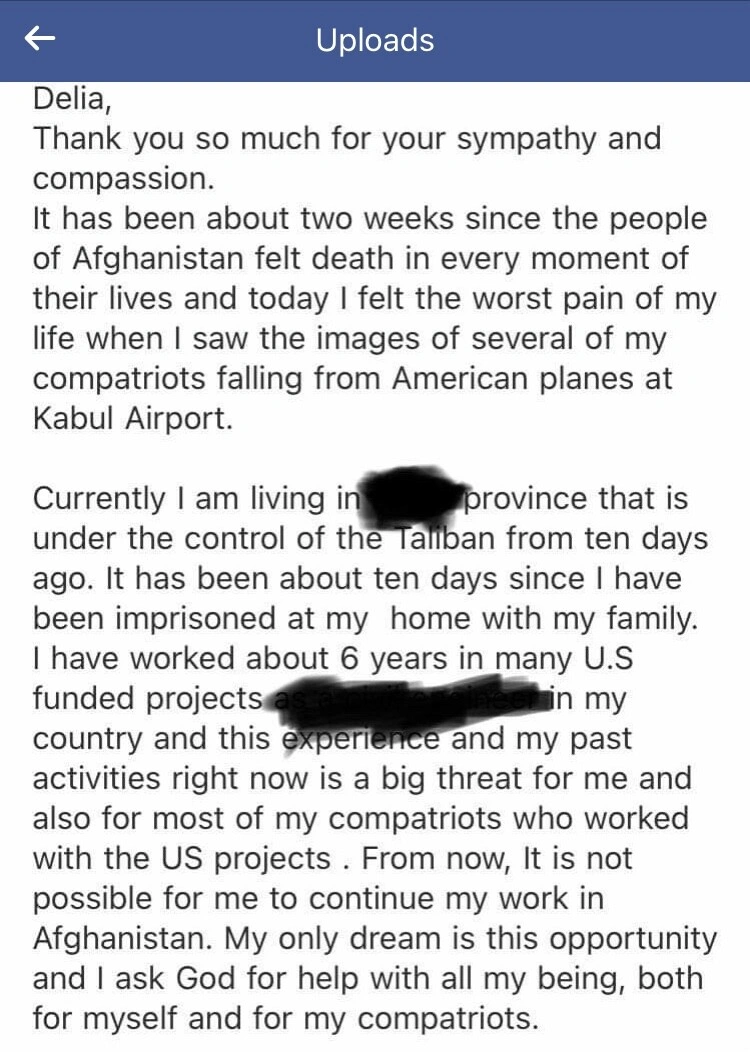 „Sper că ești bine. Cred că știi că Guvernul Afganistanului a căzut și că S.U.A. își închide Ambasada din Afganistan. Închiderea Ambasadei înseamnă respingerea aplicației mele. Am trimis aplicația la timp, dar de acum nu mai există ambasadă și situația este foarte periculoasă. Aș dori să contactez biroul principal al programului Humphrey și să solicit revizuirea aplicației mele. Este foarte important pentru mine și îmi este foarte greu să accept respingerea aplicației din cauza situației politice din țara mea. (...) Dacă ai vreun contact, te rog să-l împărtășești cu mine. Chiar am nevoie de ajutorul tău.”