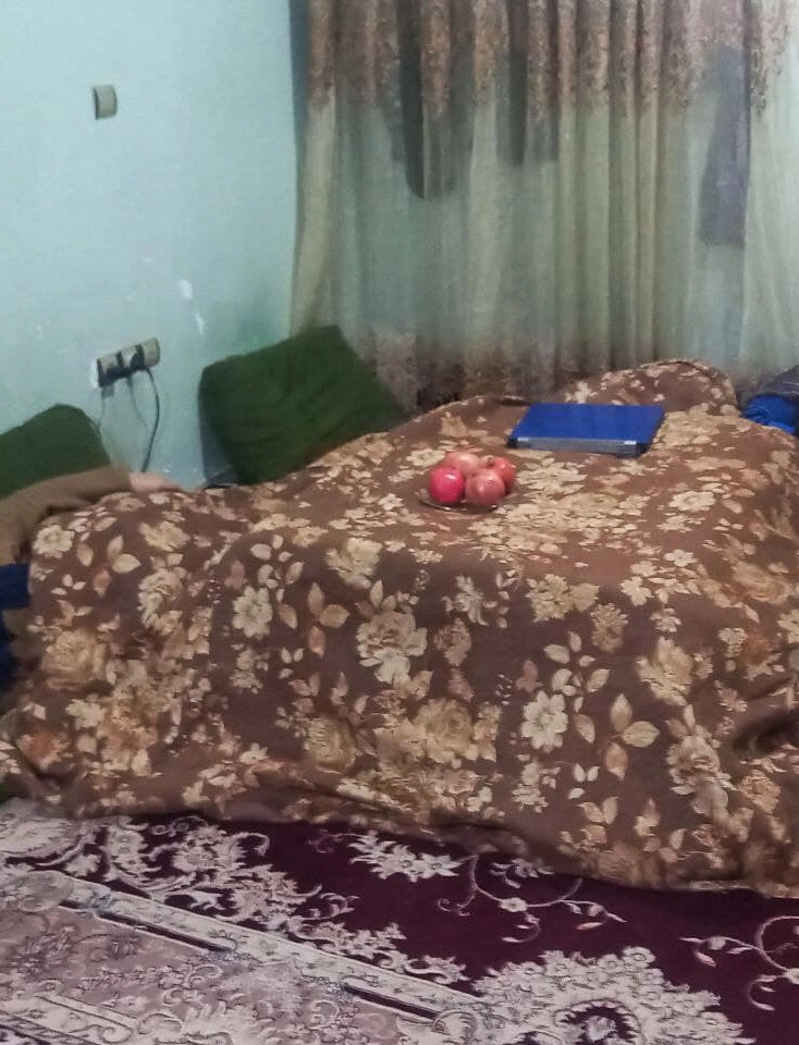 În casă nu avem mereu electricitate și ne încălzim printr-o metodă tradițională, se numește sandali. Punem cărbuni într-un vas de tablă, apoi un suport de lemn în jurul lui, și o pătură peste.