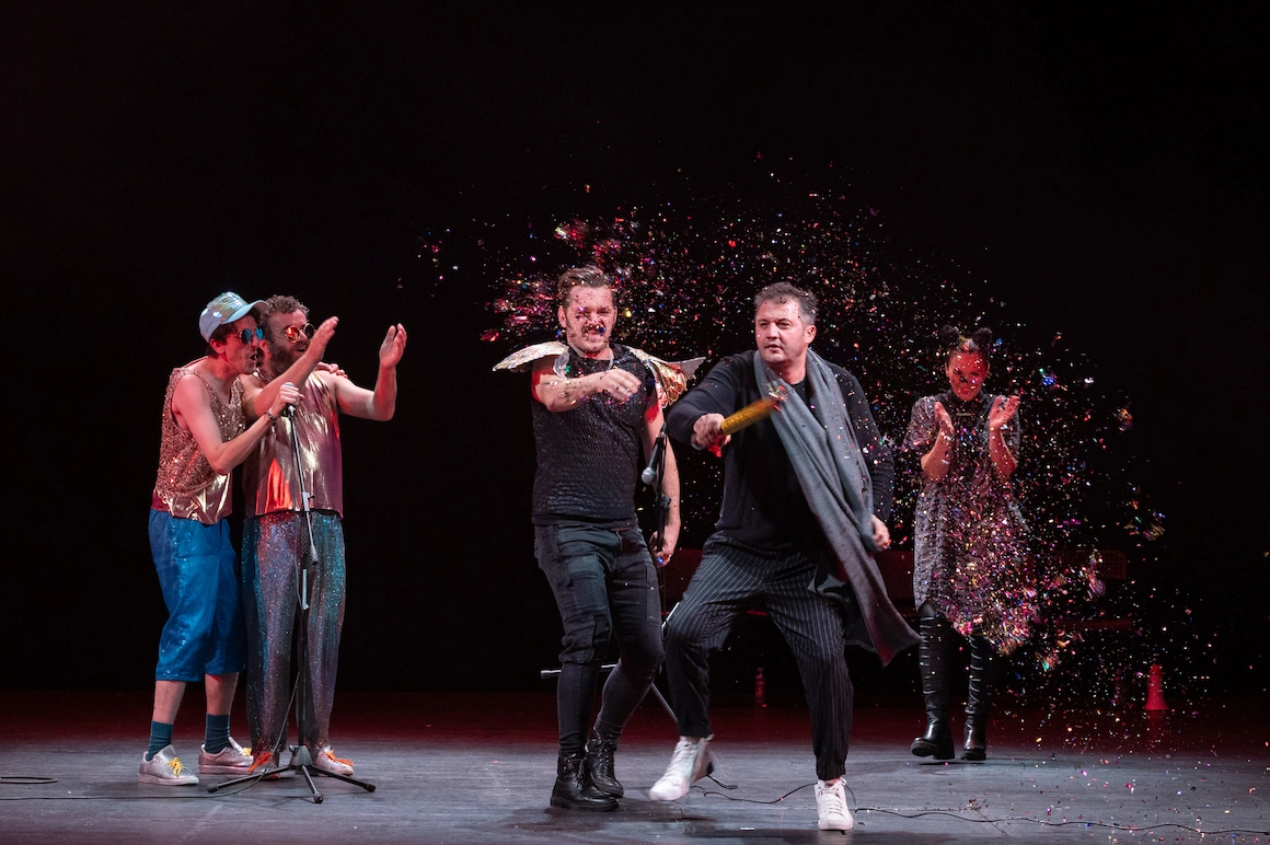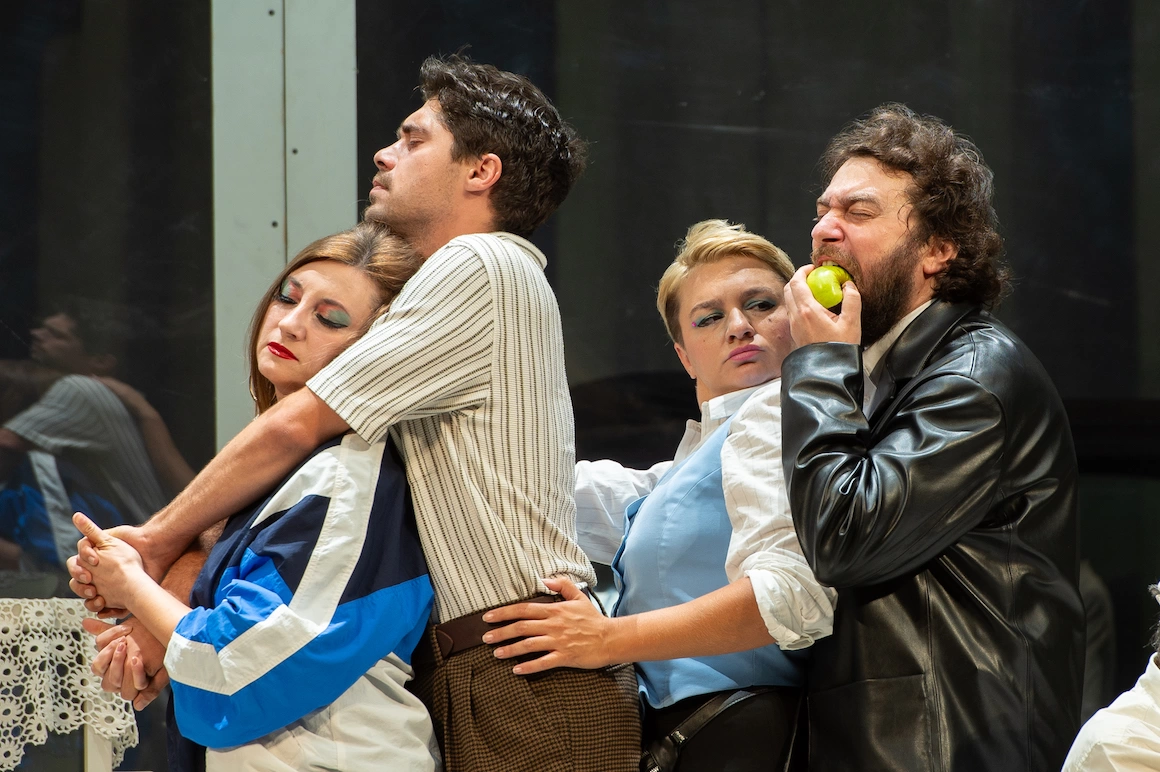 Cu Rinocerii, spectacol produs de Teatrul Tineretului, Radu Iacoban continuă să creeze mecanisme scenice narative pentru piesele lui Eugen Ionescu (la fel făcea și în Cântăreața cheală la Teatrul Maria Filoti din Brăila). Aici, decorul împarte scena în două – în față este un cadru realist, un cafe-bar luminos în care personajele discută, aproape absurd-caragialiean, noutățile zilei. Se fracturează acțiuni, se destructurează limbi și se parazitează logica. În fundal, separat de un perete de sticlă, universul rinocerilor devine terifiant, fără a înceta să fie provocator vizual. Sunt de impact măștile care transformă rinocerii într-un fel de extratereștrii, ceva mai atractivi vizuali, dar și mai înfricoșători. Bătălia se dă între două civilizații, două specii, două forme de gândire incompatibile. Ascensiunea ideilor extremiste, a naționalismului și fascismului contemporan, tot mai neliniștitoare cu cât ele se insinuează în miezul unor democrații stabile, patentate istoric și pe care le credeam indestructibile, se regăsește în parabola lui Ionescu pe care Iacoban o face inteligibilă narativ și vizual. Și e un aspect aici care tușează teza din spectacolul Schwartz / Kordonsky de la Teatrul German de Stat Timișoara, Dragonul: răul este contaminant. Berenger (Mircea Postelnicu), singur în fața unui univers acaparat de civilizații străine, pare prins într-o luptă sisifică și devine un expozant eminamente al lucidității, dar și al iluzoriului, fără să-și cultive vreo aură de erou. Rinocerii este un spectacol generos cu partiturile actoricești, îmbogățite fiecare cu două, trei identități performative. Aș remarca cameleonismul lui Florin Hrițcu în Jean și aliterațiile lui identitare și modul ingenios în care Dragoș Ionescu, Logicianul, joacă cu părul.