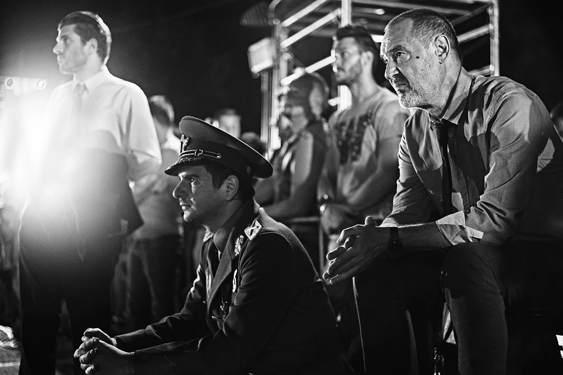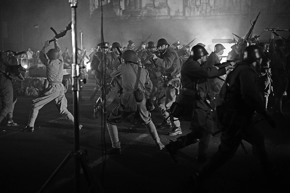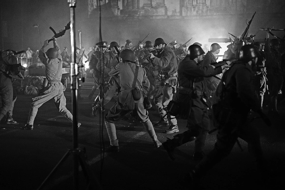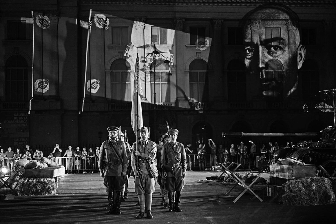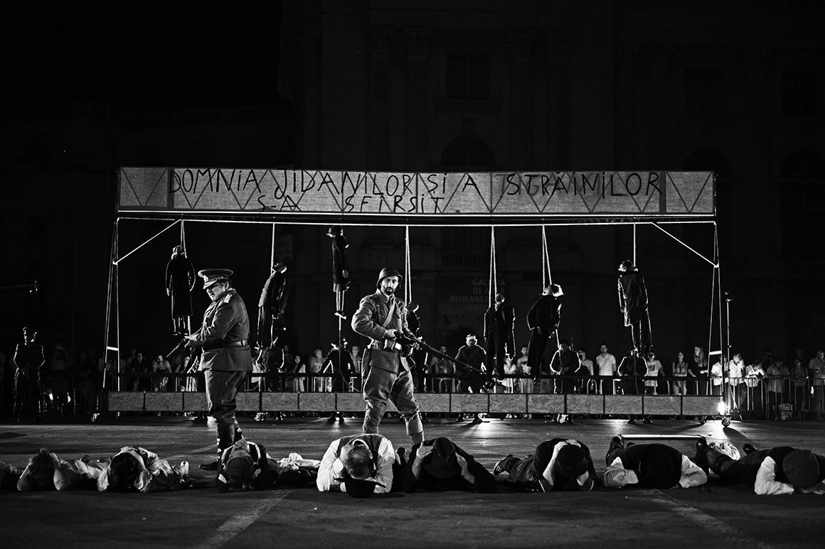 Fotografiile lui Adi Tudose au fost făcute într-una dintre nopțile de pe Calea Victoriei. O să-i găsiți în ele pe regizorul Radu Jude, regizoarea secundă Cristina Iliescu, actorii Alexandru Dabija (fabulos în rolul unui funcționar al primăriei mai degrabă relativist decât negaționist), Șervan Pavlu, Gabriel Spahiu, Alex Bogdan, pe operatorul Marius Panduru și câțiva figuranți, fără de care spectacolul tragic și ridicol al reconstituirii masacrului n-ar fi fost posibil.