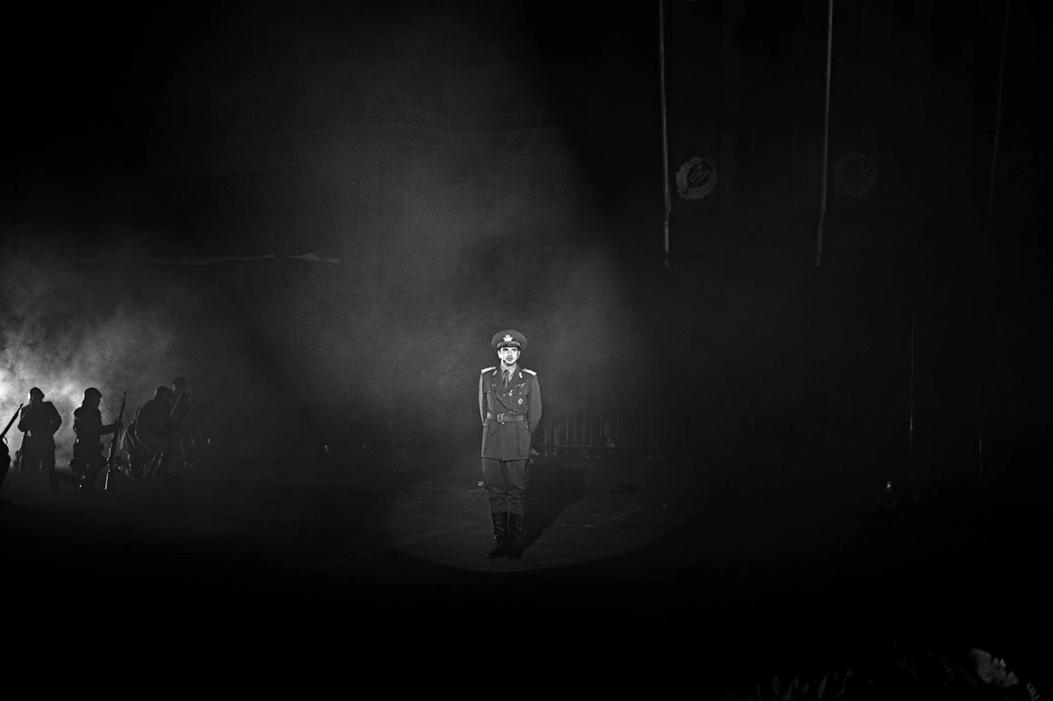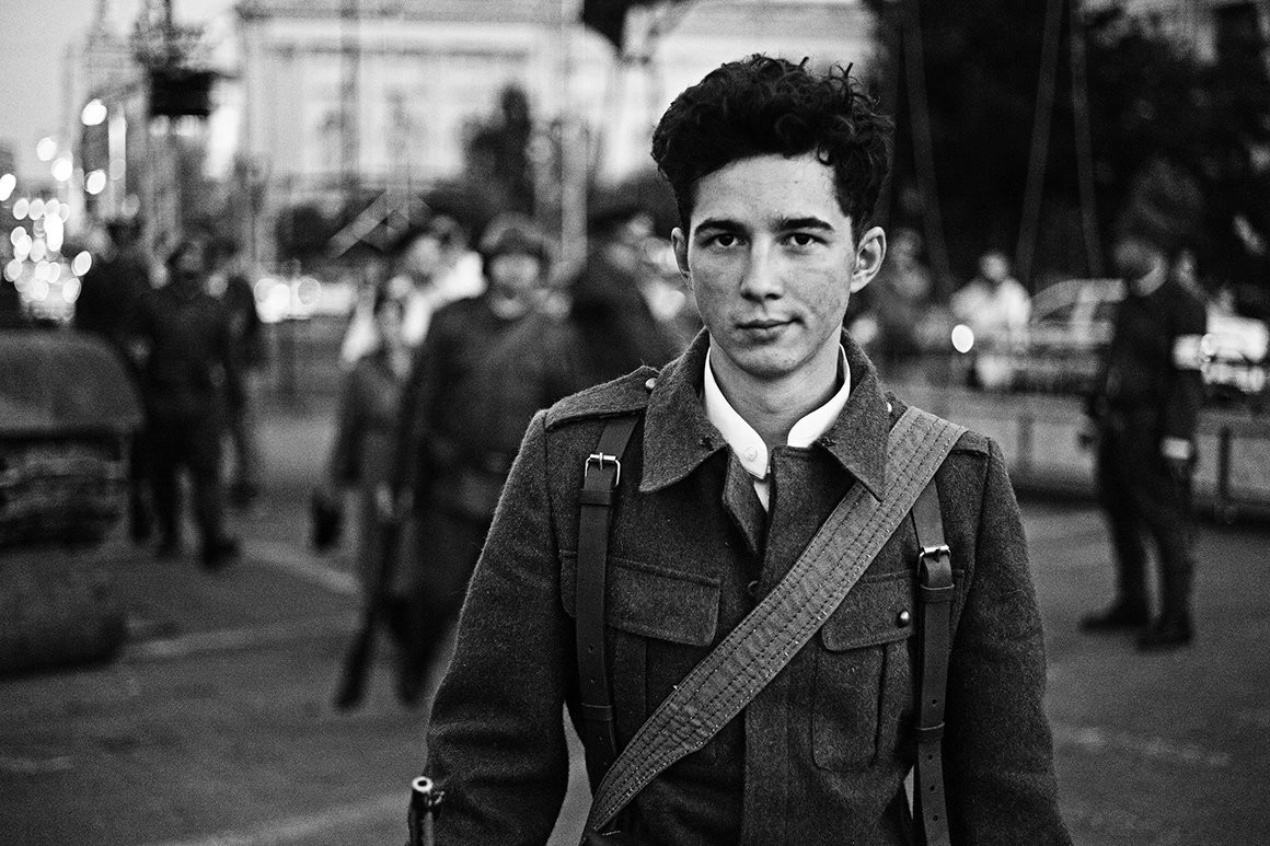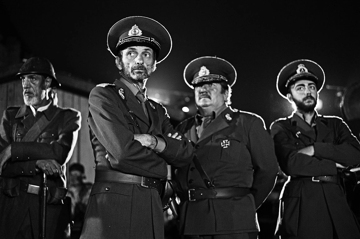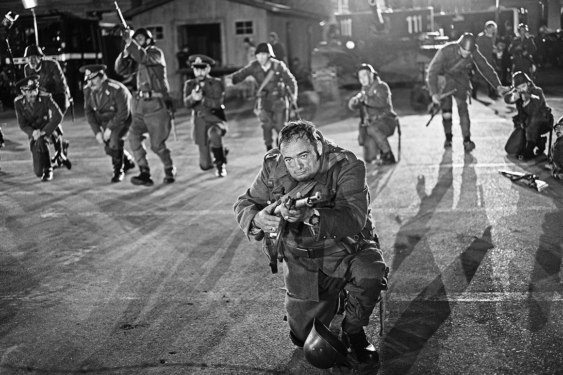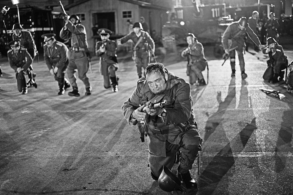 Fotografiile lui Adi Tudose au fost făcute într-una dintre nopțile de pe Calea Victoriei. O să-i găsiți în ele pe regizorul Radu Jude, regizoarea secundă Cristina Iliescu, actorii Alexandru Dabija (fabulos în rolul unui funcționar al primăriei mai degrabă relativist decât negaționist), Șervan Pavlu, Gabriel Spahiu, Alex Bogdan, pe operatorul Marius Panduru și câțiva figuranți, fără de care spectacolul tragic și ridicol al reconstituirii masacrului n-ar fi fost posibil.