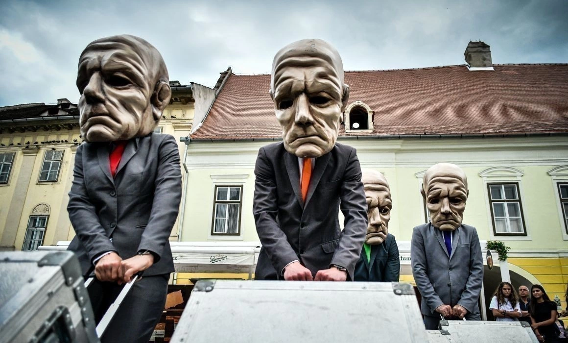 Într-un spectacol ca Pulcinella în paradă, de exemplu, vezi cum trupa de artiști italieni trage strada după ei și adună oameni pe parcurs într-un ceremonial cu rădăcini în Commedia dell’Arte. Dar spre deosebire de acest tip de teatru, care respectă formatul comediei italiene de secol 16, Graba noastră cea de toate zilele - un spectacol deștept și amuzant al teatrului KTO din Cracovia - propune o cu totul altă experiență. Se joacă tot pe stradă și se poartă tot măști, doar că miza e actuală: o poveste despre muncă, rutină și epuizare în secolul 21, spusă prin mijloace foarte simple. Nu se fac jonglerii și nu scoate nimeni flăcări pe nas, sunt doar niște oameni îmbrăcați office ce reproduc cu mult umor parcursul anost al unei zile de muncă la birou, care se sfârșește c-o beție în club. Simplitatea atrage publicul în cazul ăsta, spectacolul îți sare în ochi tocmai pentru că nu e strident și zgomotos. Am văzut aseară cum, în câteva minute, s-au adunat sute de oameni (de toate vârstele) în jurul actorilor. Abia în momente din astea înțeleg cât de cât cam care e treaba cu funcția ritualică a teatrului.