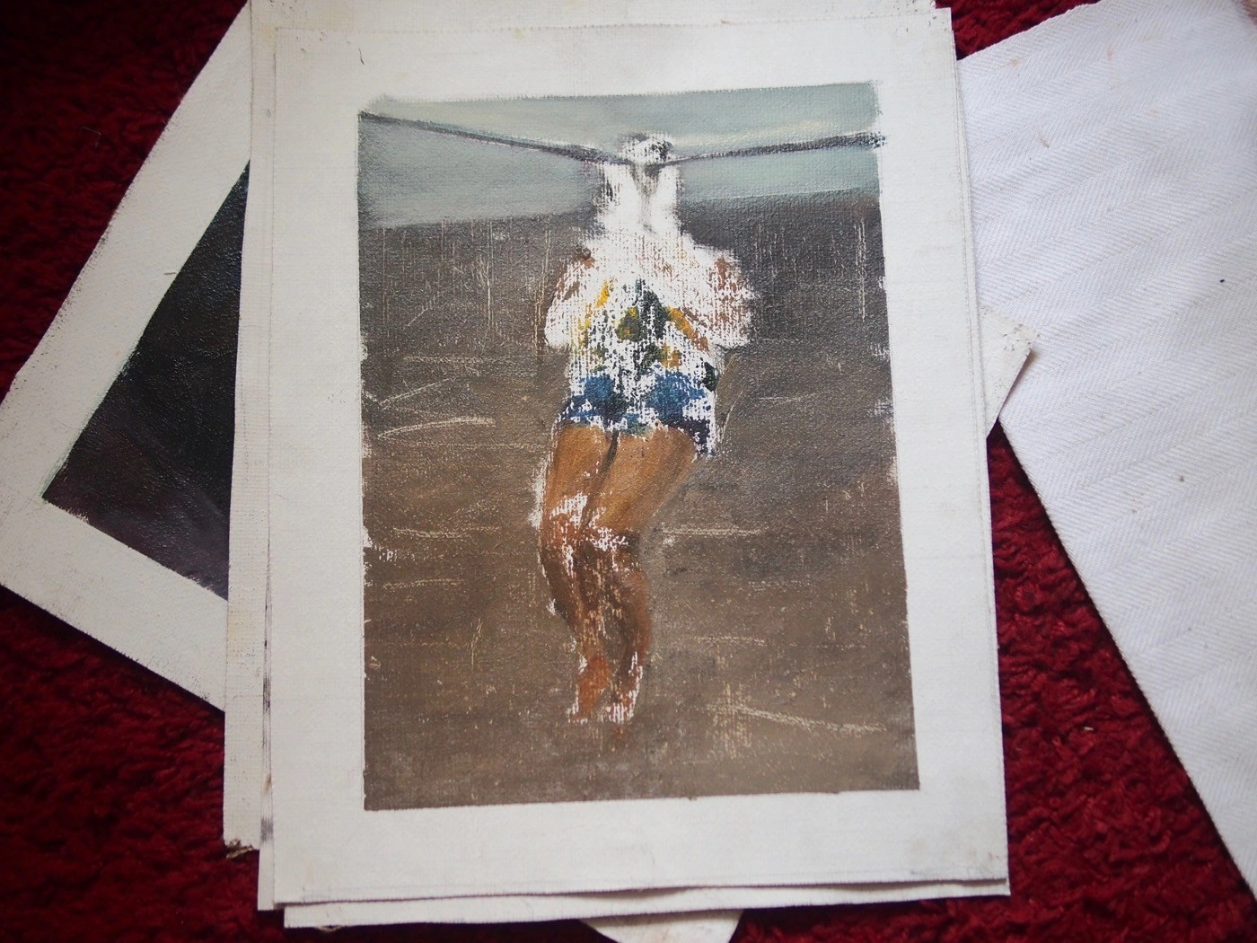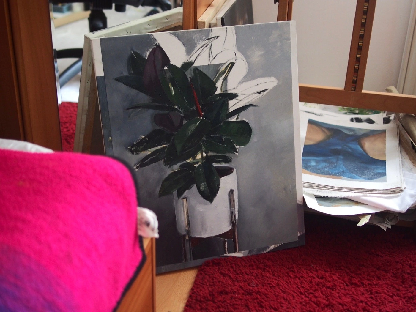 Pe patul acoperit de o cuvertură mov e o pernă mică, sprijinită de perete. Acela e cel mai bun punct de observație pentru picturile la care Flavia lucrează acum. De acolo poate să aibă o vedere de ansamblu și să vadă, de exemplu, dacă liniile sunt drepte, dacă perspectiva e corectă. În cameră mai sunt un șevalet mic lângă fereastră, o lampă de studio, un fotoliu. Miroase vag a terebentină, o substanță care diluează pigmentul de culoare.