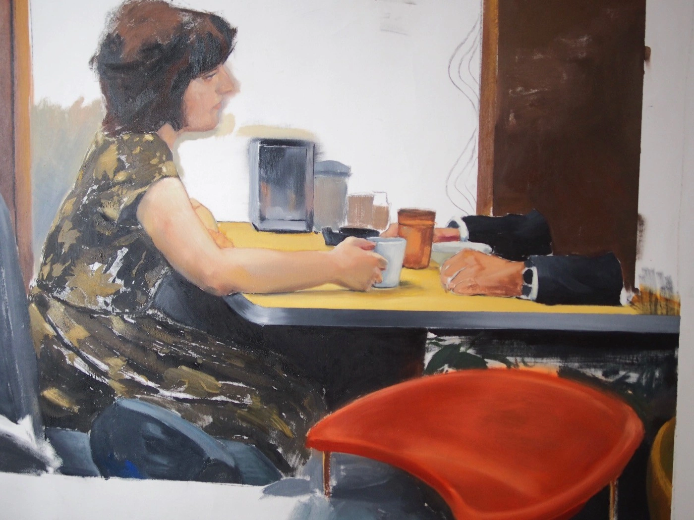 Multe dintre lucrările din camera ei înfățișează femei într-o cafenea sau un bufet, care par prinse într-o așteptare fără obiect. Aici văd asemănarea cu Hopper. Starea aceea în care nu știi dacă un om tocmai a ajuns într-un loc sau e pe cale să plece.