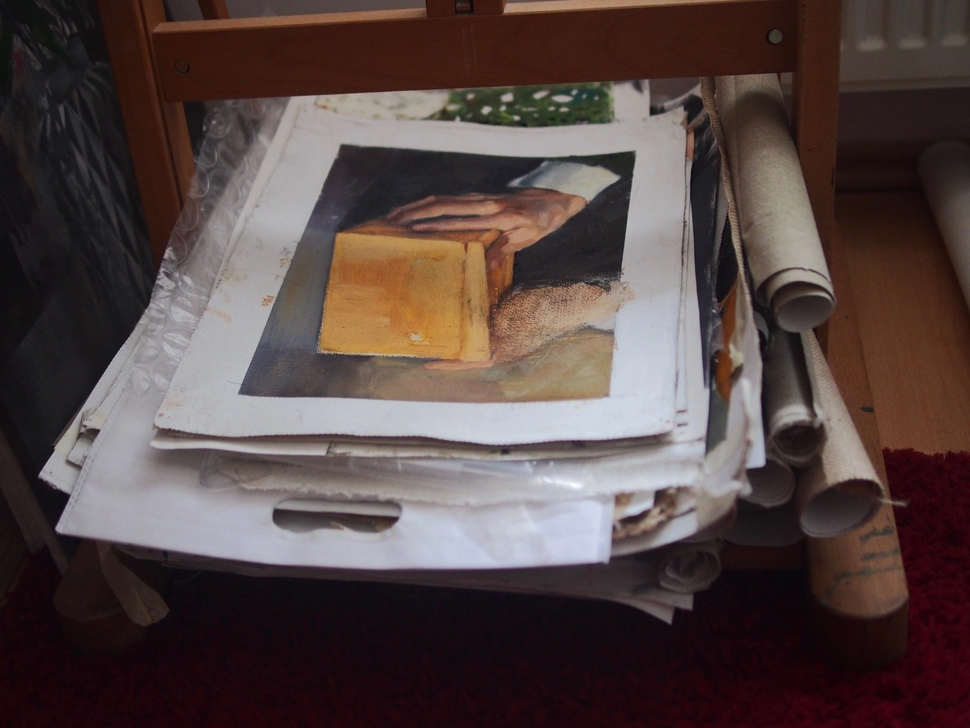 Știe cu precizie momentele când intră lumina în camera ei de lucru. La 9, la 14 și la 16. Și într-adevăr, pe măsură ce vorbim, lumina intră în cameră și transformă spațiul și lucrările. Cade mai întâi pe un tablou mic, care e un fel de reinterpretare a lui Courbet, apoi pe cele două picturi de lângă fereastră înfățișând interioare de cameră, după care ajunge pe tabloul cel mai mare, de 90 pe 70 de cm, reprezentând o femeie așezată la o masă, față în față cu un bărbat la care îi vezi doar mâinile, fiind ascuns de un paravan.
