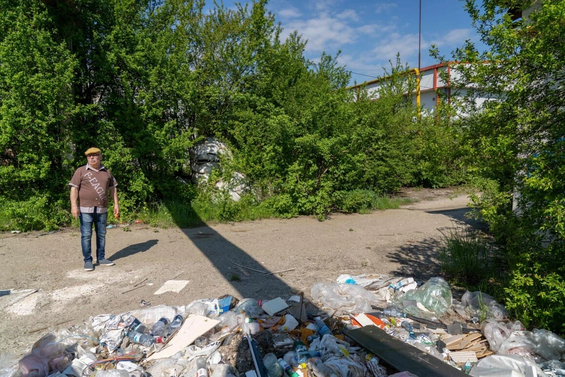„Pot să vă duc într-un loc mișto, deși nu e foarte locuibil”. E o fabrică de ceramică părăsită de peste drum, în care a filmat un promo pentru volumul „Dezintegrare”. Ca să ajungem acolo trebuie să traversăm neregulamentar. Prezența noastră prin această lume năpădită de buruieni și cu miros de mortăciuni stârnește mirarea domnului Vasile (67 de ani), care-și plimbă cățelușa pe-aici. „Ce pozați, dom'le? Astea-s de pozat aici?”. Pozăm comuna în devenire, îi explicăm. „Păi dacă nu se ocupă nimeni, ce vreți?”.