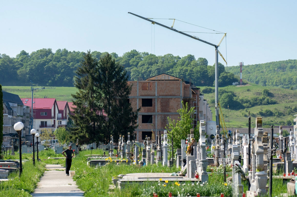De la primărie traversăm spre cimitirul comunei, de capetele căruia sunt lipite acum blocuri. „Alea în construcție din față sunt efectiv pe exproprieri de morminte făcute. E singurul cimitir, din câte știu. Sunt mulți tineri aici, dar când s-or pune pe murit, va fi o problemă.” În apropiere e centrul de incluziune socială, pe care scrie „Antreprenoriatul e șansa ta”. „Nu ai acces la încălzire și educație? Trebuie să-ți deschizi o afacere. Cine știa că poate fi atât de ușor?”.