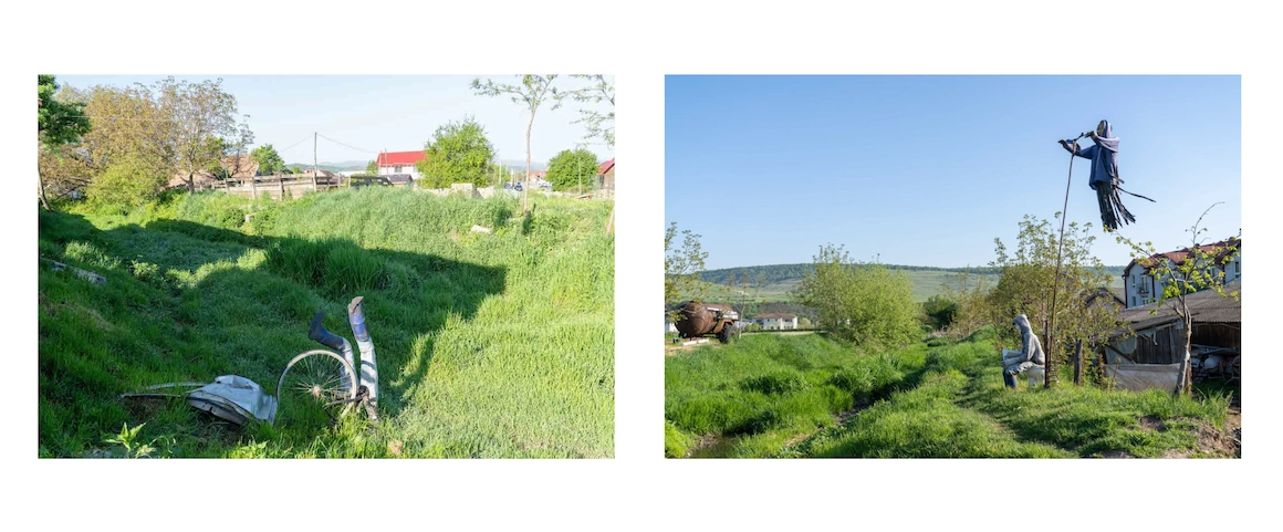 „O să vă duc într-un loc magic”. Mergem pe o străduță care se încheie brusc într-un mal înverzit și un podeț ruginit. Iar de-aici se încheagă o scenă care rupe orice ordine s-ar înfiripa în aglomerația de construcții din jur: în iarba care a crescut înaltă pare că-i un om înfipt cu capul în pământ, din care se văd doar picioarele încălțate cu cizme, lângă o portieră îndoită și-o roată de bicicletă; dincolo de podeț e un alt personaj, cu mască „V for Vendetta”, care citește pe toaletă; lângă el — înălțată pe-un par de vreo 3 metri ce se încheie într-un ghidon de bicicletă — e o fantomă, un „Dementor de Florești”.