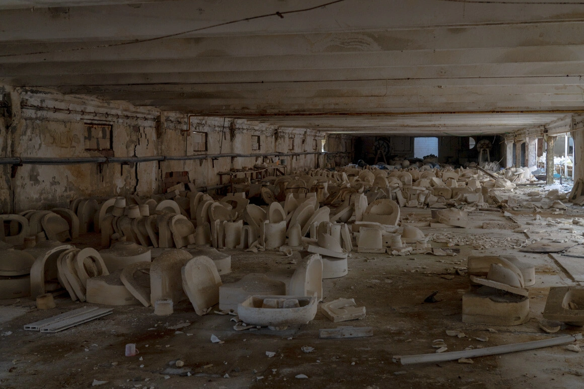 Ne despărțim de domnul Vasile după ce ne explică cum pot opri americanii războiul din Ucraina, dar nu au interesul s-o facă. Intrăm cu băgare de seamă în fabrică, alunecăm totuși pe nămol și călcăm pe cioburi, iar scrâșnitul se aude cu ecou. Sunt niște hale imense, pline cu WC-uri și chiuvete, alături de formele în care au fost turnate și cuptoarele în care au fost arse. E și un culoar către o vilă părăsită. Totul pare destul de recent, e clar că cineva a pierdut mulți bani aici.
