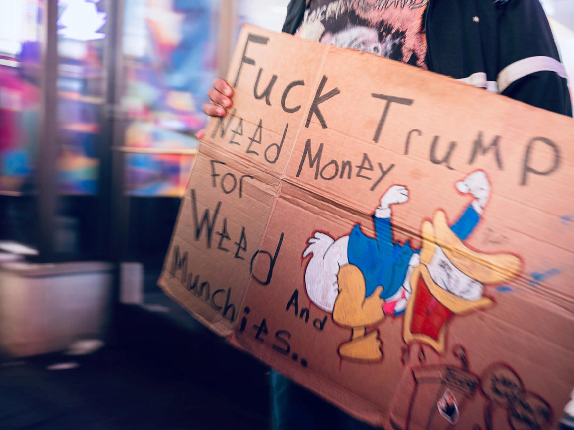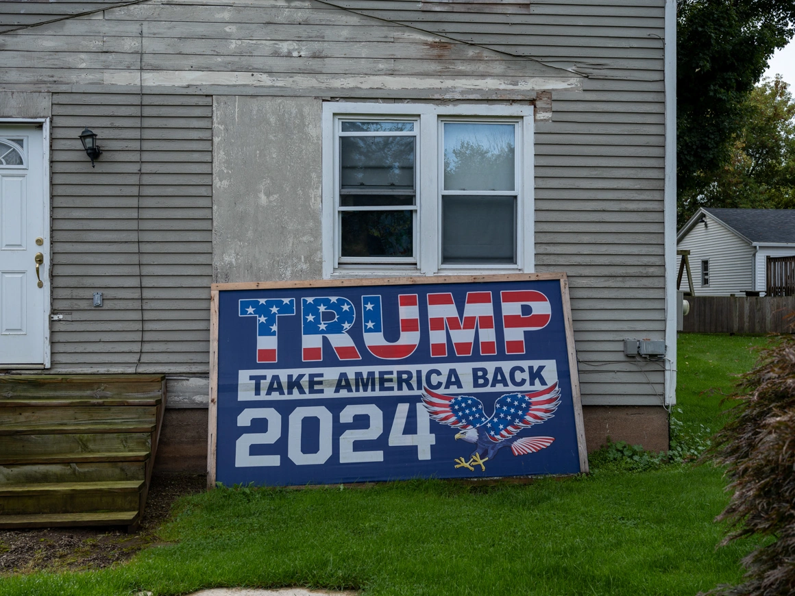Observ, într-o curte, o pancartă enormă dedicată lui Trump. Îi zic lui Sandu să facă cumva să oprească, pentru că pe aceasta chiar trebuie să o fotografiez. Este primul cadru de acest fel; mașina oprește la aproximativ 30m de „ținta” pe care mi-o propusesem, mă apropii pe jos, ajung în proximitatea curții, menținând totuși o oarecare distanță. Declanșez o dată, nu apuc să trag al doilea cadru și aud pe cineva țipând „What are you doing?!?!?! Hey, hey, what are you doing?!”
