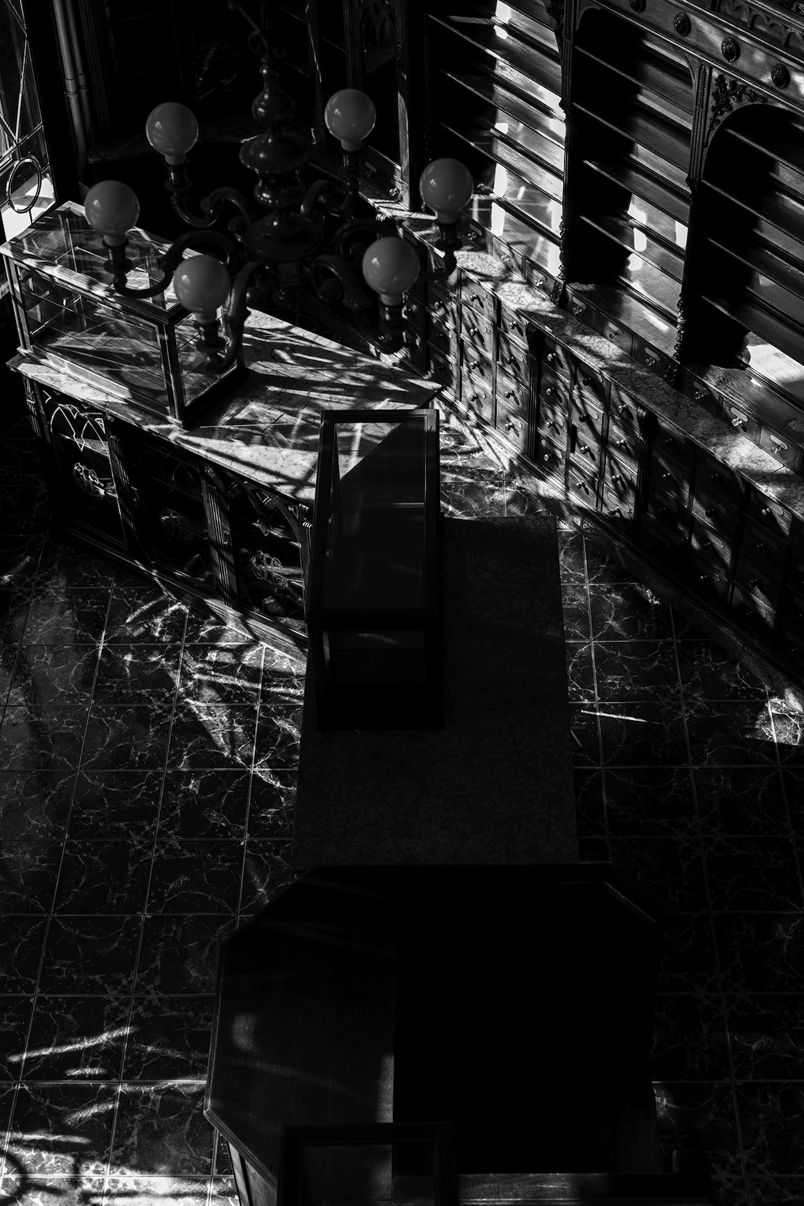 Farmacia funcționa pe trei niveluri: laboratorul la subsol, rafturile pentru vânzare la parter și depozitul de medicamente la mezanin. Etajele superioare erau pentru locuit: două apartamente, la primul și al doilea etaj.