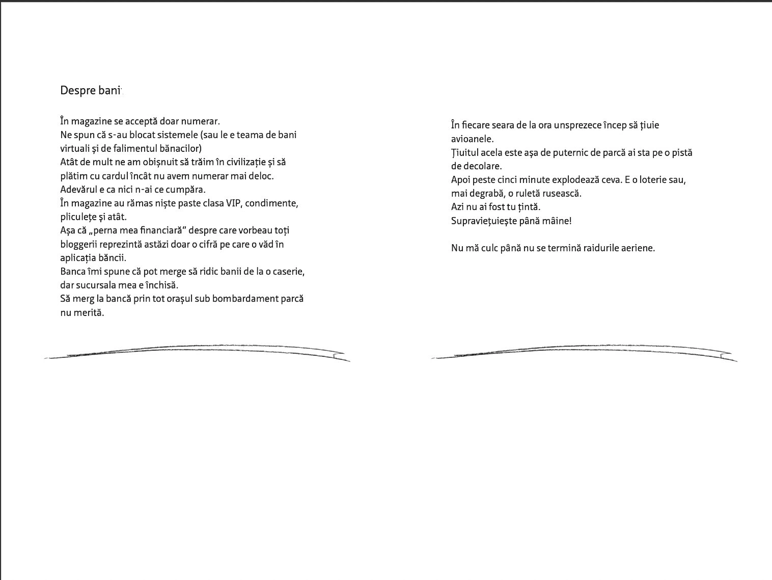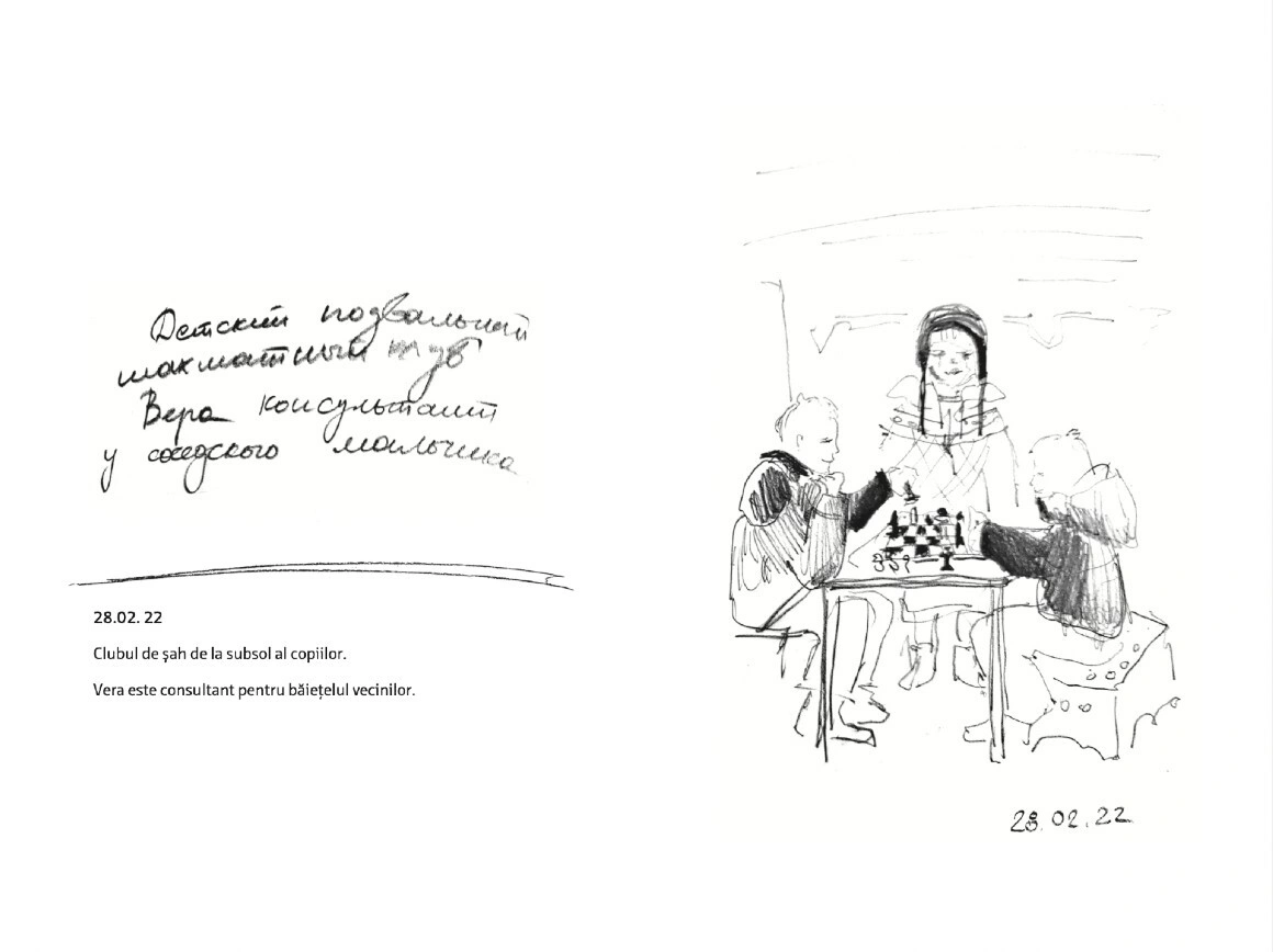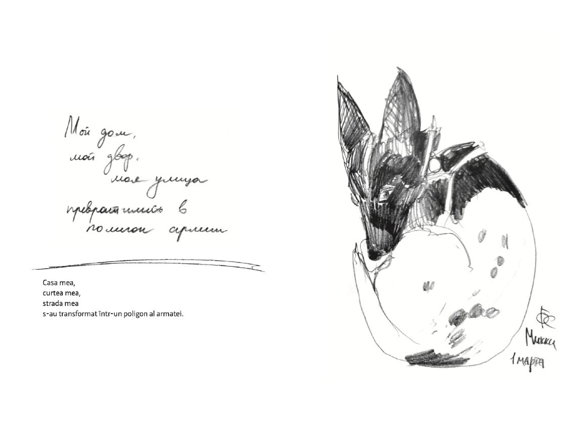 Citește mai jos, în premieră, fragmente din jurnalul scris și ilustrat de Olga Grebennik în cele 8 zile din februarie și martie pe care le-a petrecut într-un subsol din orașul ei, Harkiv. „Desenul a devenit singura portiță către lumea mea interioară care din afară era bombardată de avioane”, scrie Olga. „Toată frica mea o revărsam pe hârtie. (...) Lumea se dărâma, iar eu în ciuda războiului mă ocupam cu creația. Ca să supraviețuiesc. Acest caiet era firul de ață de care mă agățam cu toată forța.”