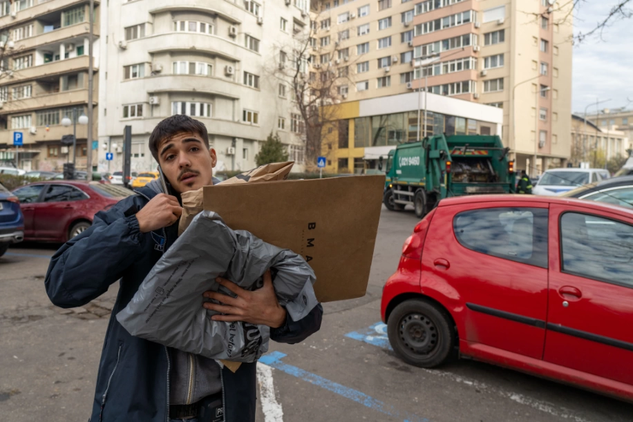 „Gabi este un băiat grozav”, spun clienții despre un curier de 22 de ani, proaspăt tată, care deservește o zonă ultracentrală a Bucureștiului. Livrează cam 120 de colete pe zi și adesea pachetele cântăresc aproape cât el. L-am însoțit într-o tură la serviciu, pentru a afla cât e de grozav, dar și cât de grea îi e munca.