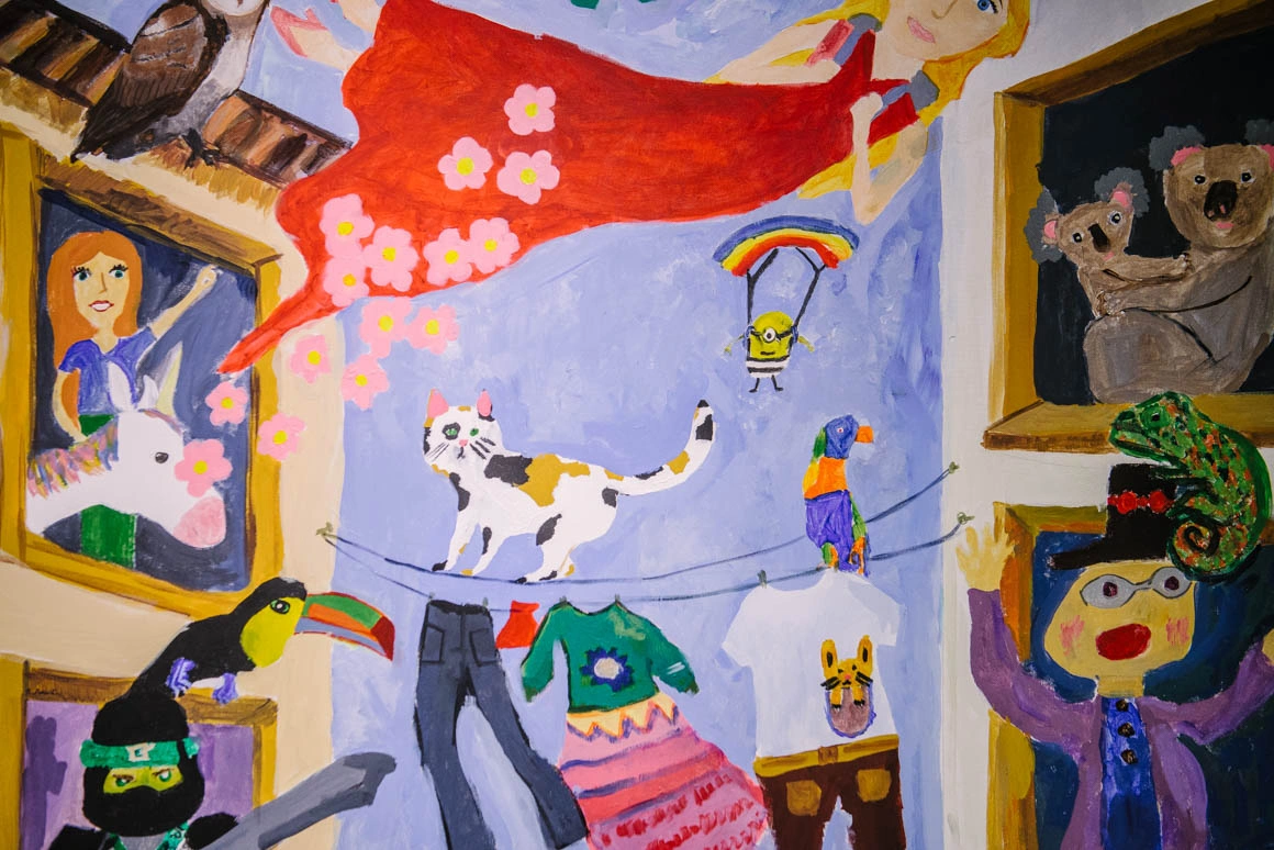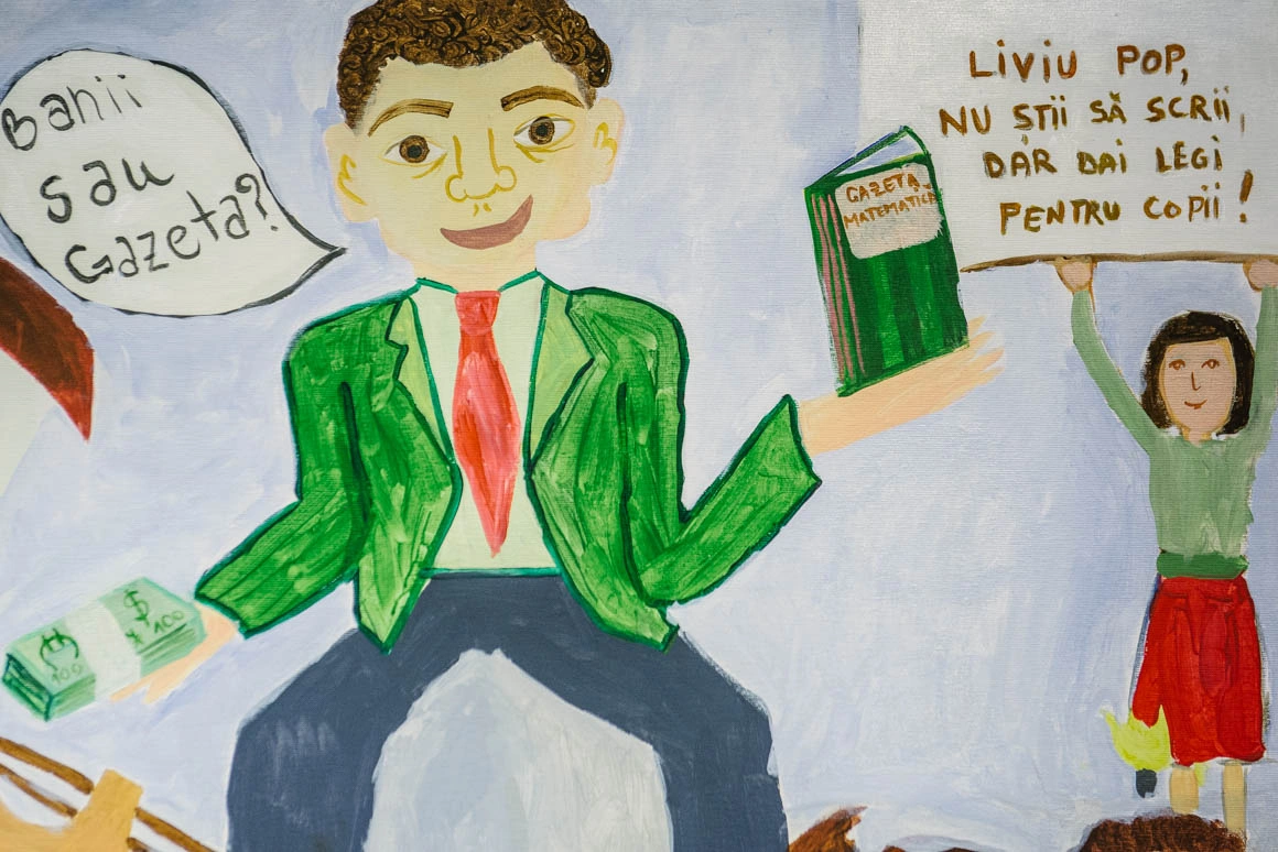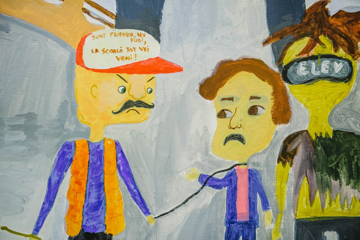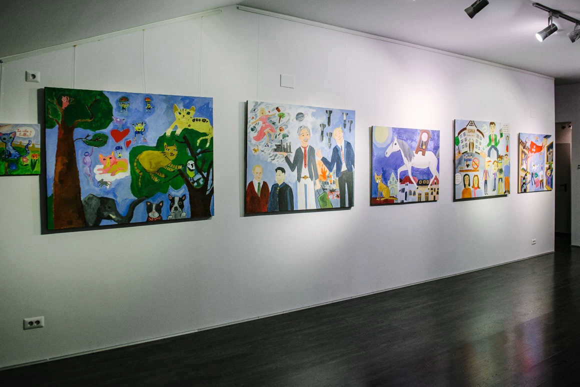La Galeria Romniceanu expun tineri artiști cu vârste cuprinse între 5 și 14 ani. Pentru expoziția de față, copiii au fost invitați să-și picteze lumea. A ieșit un caleidoscop în care încap și Liviu Pop și minionii și Donald Trump și unicornii, plus căței, pisici și alte animăluțe de prin case.