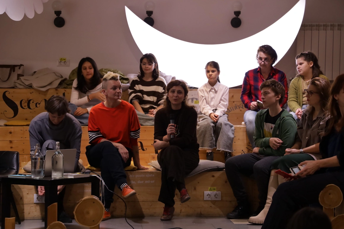 Am ajuns la Seneca Anticafe, după ce m-am plimbat pe străduţe, încercând să îmi imaginez cum va decurge lansarea. Recunosc că nu-mi e o zonă foarte accesibilă, nu mai fusesem niciodată în acea librărie. De când am intrat, m-a entuziasmat atmosfera primitoare și intimă. Părinţi şi copii curioşi şi nerăbdători au umplut locul. Copiii s-au aşezat în jurul autoarelor, aşteptând să le afle povestea şi să le pună întrebări.