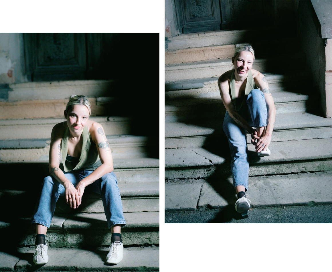 Nori de praf se amestecă cu zăpușeala de septembrie, fațada unei clădiri cu bulină se dărâmă vizavi de Cinemateca Eforie, totul e puțin postapocaliptic și cumva potrivit. De fiecare dată când mă întâlnesc cu Ilinca, fie din întâmplare, fie stabilit, e la fel de în mișcare precum personajul pe care l-a jucat în fața camerei timp de patru săptămâni. Filmul e într-un periplu prin festivaluri, adună din ce în ce mai multe laude, iar Ilinca e pe rollercoasterul emoțional care însoțește avalanșa asta de atenție. E o zână punk cu guler de catifea roz, alunecând printre blocurile scorojite din București, pendulând între stări contradictorii.