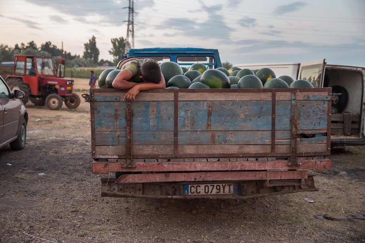 La maşinuţele electrice, însă, mai nimeni: noaptea se rostogoleşte ca un pepene cu coaja neagră peste siglele de BMW. Doi pepeni vărgaţi, a la Sorento, un soi foarte căutat astăzi, stau în faţa scenei, încadraţi de foi A4, pe care scrie „Lubeniţa de Aur”.