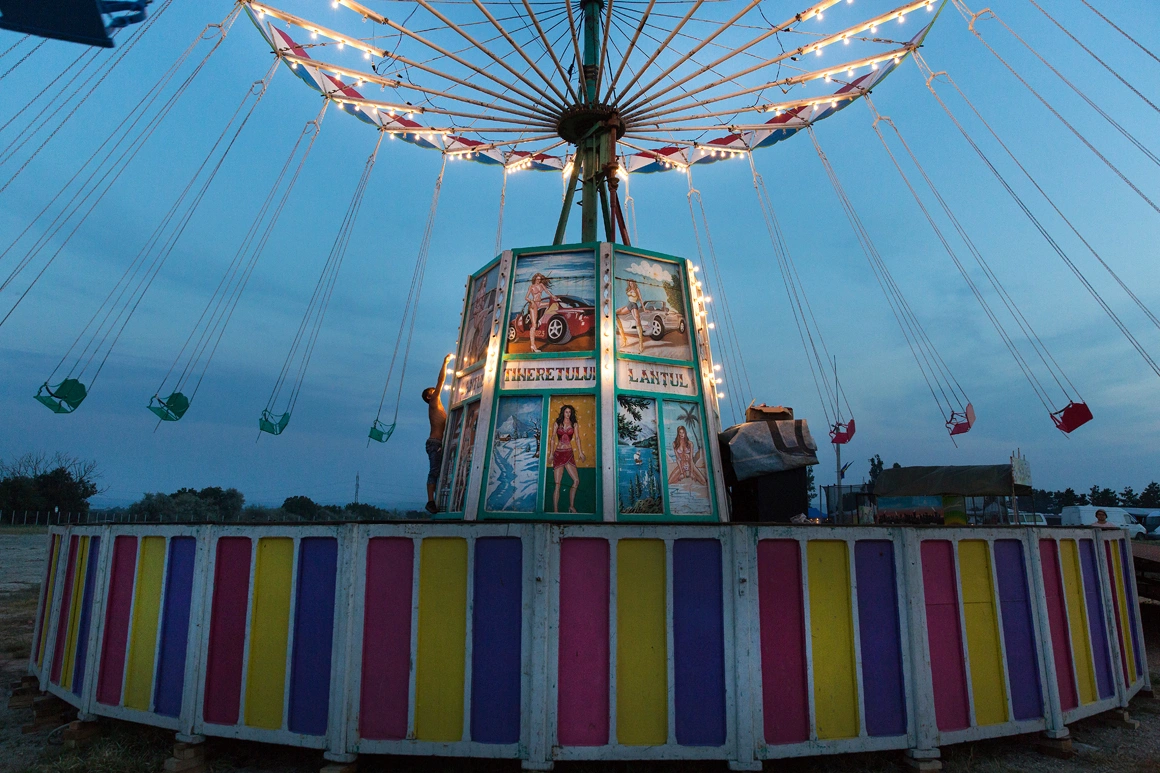 Atracţia e, însă, un soi de montagne-russe care te ţine înţepenit în scaune şi te smuceşte sus-jos, stânga-dreapta, în acelaşi plan, ca un rând dintr-o sală de cinema pe un vapor în furtună. Aparatul degajă împrejur lumina rece de neon pe fundalul albastru al cerului şi strânge oamenii care privesc amuzaţi jocul de schimonoseli de pe feţele tinerilor.