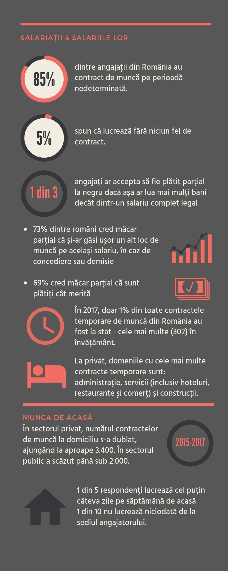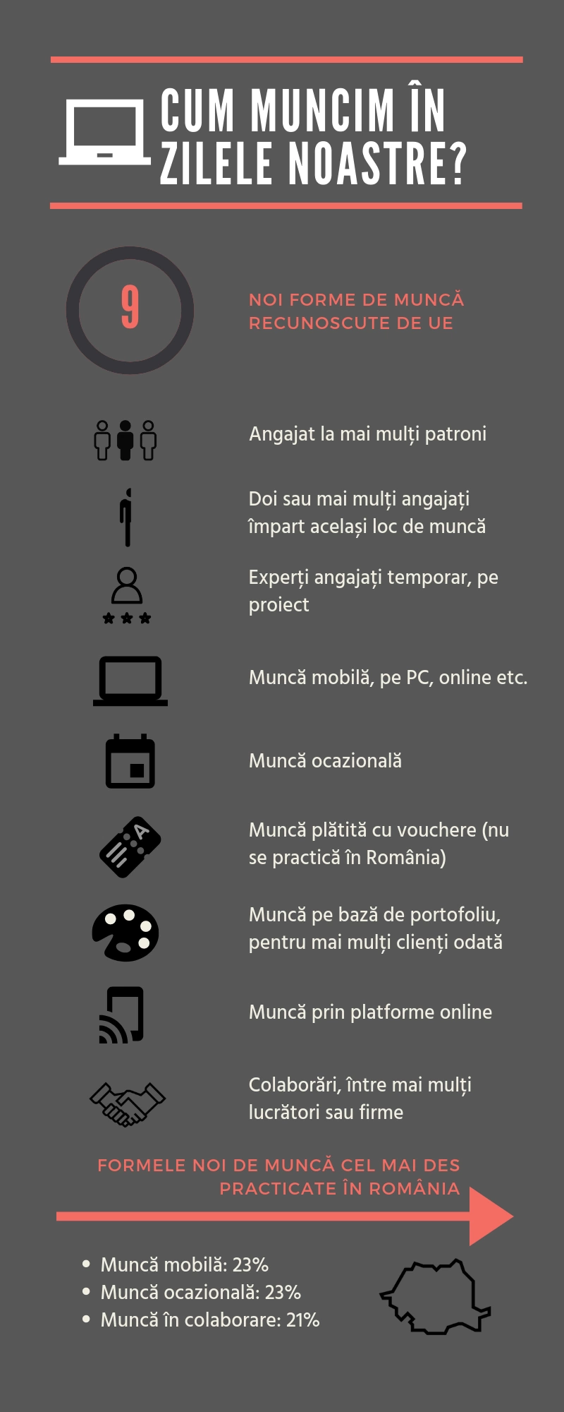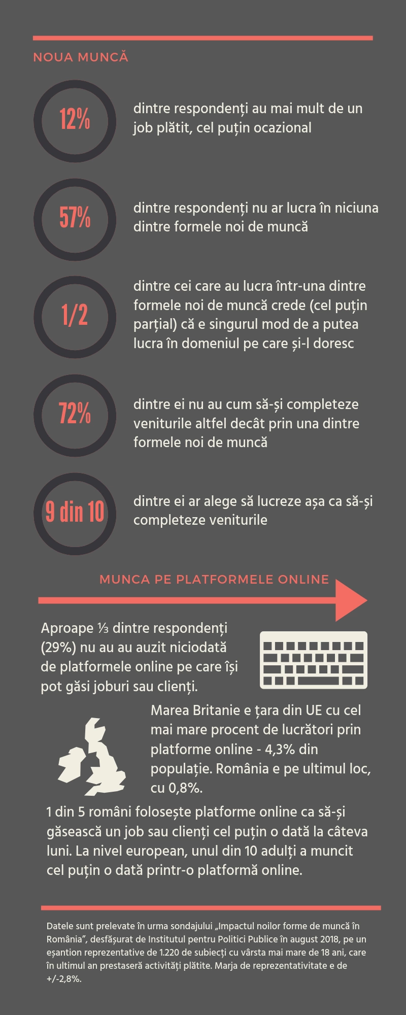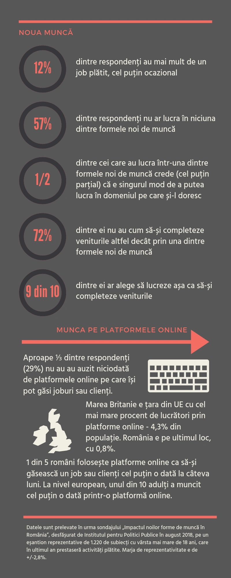 Am selectat mai jos câteva dintre datele prezentate în raport, despre noile forme de muncă în România. Piața muncii e într-o evidentă și majoră schimbare și deși majoritatea angajaților români au contract de muncă și salariu, mulți dintre noi se străduiesc să facă un ban în plus, fără ca legile să fie pregătite pentru toate situațiile în care ne regăsim. Poate că datele astea vor contribui la politici care să ne facă să ne simțim mai puțin exploatați, epuizați și precari.